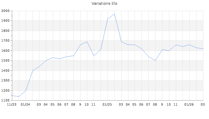 Date d'inscription : 26/11/23. Donateur pour EchecsEmail : Non ( Cliquez ici pour soutenir EchecsEmail. ) Elo non arrondi:1621.5 ( 308 sur 442 joueurs ) Nombre de victoires :425 Nombre de nulles :53 Nombre de défaites :288 Temps de réponse moyen par coup : 0J 1H 20M 39S ( Moyenne sur 1193 coups ). Rd ( Un petit rd indique un elo fiable ) : 58 Elo maximum atteint ( en étant classé ) :2000 Elo maximum atteint cette année :1680 Nombre coups joués : 24912 Classement coupe : Inactif, date de la dernière qualification : 03/03/25 Points coupe : 170.4 Classement Coupe Magic Chess : Inactif Points Coupe Magic Chess : 0 Tournoi échelle : Inactif. Tournois gagnés : 30/04/2025 : Cat 3 : Victoire dans le tournoi n°26574 29/04/2025 : Cat 3 : Victoire dans le tournoi n°26571 21/03/2025 : Cat 3 : Victoire dans le tournoi n°26583 16/03/2025 : Cat 3 : Victoire dans le tournoi n°26569 07/03/2025 : Cat 4 : Victoire dans le tournoi n°26553 26/02/2025 : Cat 3 : Victoire dans le tournoi n°26521 23/02/2025 : Cat 3 : Victoire dans le tournoi n°26501 22/02/2025 : Cat 3 : Victoire dans le tournoi n°26477 22/02/2025 : Cat 3 : Victoire dans le tournoi n°26513 21/02/2025 : Cat 3 : Victoire dans le tournoi n°26410 19/02/2025 : Cat 4 : Victoire dans le tournoi n°26497 18/02/2025 : Cat 4 : Victoire dans le tournoi n°26473 18/02/2025 : Cat 3 : Victoire dans le tournoi n°26516 12/02/2025 : Cat 3 : Victoire dans le tournoi n°26507 08/02/2025 : Cat 1 : Victoire dans le tournoi n°26364 05/02/2025 : Cat 3 : Victoire dans le tournoi n°26443 04/02/2025 : Cat 3 : Victoire dans le tournoi n°26461 01/02/2025 : Cat 3 : Victoire dans le tournoi n°26454 01/02/2025 : Cat 3 : Victoire dans le tournoi n°26466 29/01/2025 : Cat 3 : Victoire dans le tournoi n°26431 17/01/2025 : Cat 3 : Victoire dans le tournoi n°26396 17/01/2025 : Cat 2 : Victoire dans le tournoi n°26403 15/01/2025 : Cat 3 : Victoire dans le tournoi n°26415 10/01/2025 : Cat 2 : Victoire dans le tournoi n°26389 09/01/2025 : Cat 2 : Victoire dans le tournoi n°26406 05/01/2025 : Cat 2 : Victoire dans le tournoi n°26380 02/01/2025 : Cat 1 : Victoire dans le tournoi n°26368 31/12/2024 : Cat 2 : Victoire dans le tournoi n°26381 07/10/2024 : Cat 2 : Victoire dans le tournoi n°26088 Nombre de tournois gagnés :29