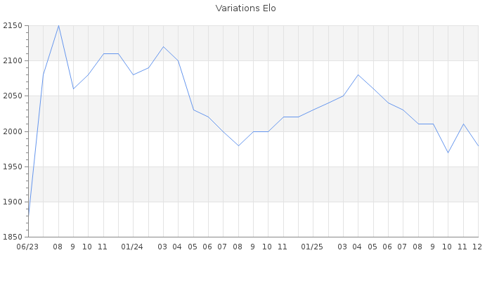 Date d'inscription : 12/06/23. Donateur pour EchecsEmail : Non ( Cliquez ici pour soutenir EchecsEmail. ) Elo non arrondi:1981.7 ( 136 sur 452 joueurs ) Nombre de victoires :155 Nombre de nulles :20 Nombre de défaites :74 Temps de réponse moyen par coup : 0J 5H 35M 32S ( Moyenne sur 558 coups ). Rd ( Un petit rd indique un elo fiable ) : 71 Magic Elo:1700 Magic Rd : 350 Elo maximum atteint ( en étant classé ) :2150 Elo maximum atteint cette année :2090 Nombre coups joués : 9398 Inscrit dans l' équipe:Mission Impossible Classement coupe : 73 Points coupe : 250.85 Classement Coupe Magic Chess : Inactif Points Coupe Magic Chess : 0 Tournoi échelle : Inactif. Tournois gagnés : 24/05/2025 : Cat 4 : Victoire dans le tournoi n°26676 21/08/2023 : Cat 4 : Victoire dans le tournoi n°25018 12/07/2023 : Cat 2 : Victoire dans le tournoi n°25021 02/07/2023 : Cat 2 : Victoire dans le tournoi n°24995 Nombre de tournois gagnés :4