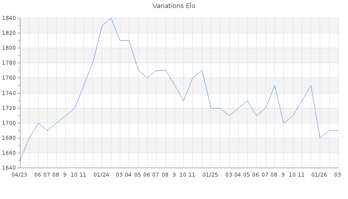 Date d'inscription : Avant le 20/12/05. Donateur pour EchecsEmail : Non ( Cliquez ici pour soutenir EchecsEmail. ) Elo non arrondi:1689.5 ( 270 sur 442 joueurs ) Nombre de victoires :875 Nombre de nulles :136 Nombre de défaites :1280 Temps de réponse moyen par coup : 0J 16H 55M 16S ( Moyenne sur 533 coups ). Rd ( Un petit rd indique un elo fiable ) : 69 Magic Elo:1488.02 Magic Rd : 262 Elo maximum atteint ( en étant classé ) :1850 Elo maximum atteint cette année :1730 Nombre coups joués : 71813 Inscrit dans l' équipe:Les diplomates Classement coupe : 122 Points coupe : 22.55 Classement Coupe Magic Chess : Inactif Points Coupe Magic Chess : 0 Tournoi échelle : Inactif. Tournois gagnés : 14/11/2025 : Cat 3 : Victoire dans le tournoi n°27109 17/10/2025 : Cat 3 : Victoire dans le tournoi n°26927 23/04/2025 : Cat 3 : Victoire dans le tournoi n°26606 26/01/2024 : Cat 4 : Premier au tournoi multi Noël 2023 n°4 06/11/2023 : Cat 3 : Victoire dans le tournoi n°25249 20/08/2023 : Cat 2 : Premier au tournoi multi Saint-Valentin 2023 n°1 03/06/2023 : Cat 2 : Premier au tournoi multi Saint-Valentin 2023 n°2 27/07/2021 : Cat 2 : Premier au tournoi multi Eté 2021 n°2 13/11/2020 : Cat 3 : Victoire dans le tournoi n°21792 18/04/2020 : Premier dans le Ch. 2019 : Division 2A 25/03/2020 : Cat 3 : Victoire dans le tournoi n°20751 24/03/2019 : Cat 4 : Victoire dans le tournoi n°19017 18/05/2018 : Cat 2 : Premier au tournoi multi Printemps 2018 n°3 11/07/2017 : Cat 3 : Victoire dans le tournoi n°16606 20/02/2016 : Cat 3 : Victoire dans le tournoi n°14332 21/12/2015 : Cat 3 : Victoire dans le tournoi n°18772 19/05/2015 : Cat 3 : Victoire dans le tournoi n°17591 25/02/2015 : Cat 0 : Premier au tournoi multi Noël 2014 n°5 17/12/2014 : Cat 0 : Premier au tournoi multi Halloween 2014 n°2 21/05/2011 : Cat 3 : Victoire dans le tournoi n°8464 12/02/2011 : Cat 3 : Victoire dans le tournoi n°7927 07/04/2010 : Cat 2 : Victoire dans le tournoi n°6773 02/02/2010 : Cat 0 : Premier au tournoi multi Noël 2009 n°5 05/11/2008 : Cat 1 : Victoire dans le tournoi n°4982 17/02/2008 : Cat 1 : Victoire dans le tournoi n°4451 08/10/2006 : Cat 1 : Victoire dans le tournoi n°3266 05/10/2006 : Cat 1 : Victoire dans le tournoi n°3426 20/01/2006 : Cat 0 : Victoire dans le tournoi n°2228 Nombre de tournois gagnés :31