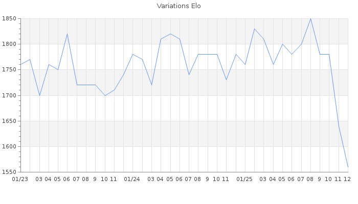 Date d'inscription : 20/01/18. Donateur pour EchecsEmail : Non ( Cliquez ici pour soutenir EchecsEmail. ) Elo non arrondi:1557.6 ( 340 sur 450 joueurs ) Nombre de victoires :5063 Nombre de nulles :395 Nombre de défaites :4207 Temps de réponse moyen par coup : 0J 1H 21M 52S ( Moyenne sur 6543 coups ). Rd ( Un petit rd indique un elo fiable ) : 55 Magic Elo:1310.91 Magic Rd : 170 Elo maximum atteint ( en étant classé ) :2020 Elo maximum atteint cette année :1880 Nombre coups joués : 313555 Inscrit dans l' équipe:Avalon Classement coupe : Inactif Points coupe : 0.03 Classement Coupe Magic Chess : Inactif Points Coupe Magic Chess : 0 Tournoi échelle : Inactif. Tournois gagnés : 23/11/2025 : Cat 3 : Victoire dans le tournoi n°27214 09/10/2025 : Cat 3 : Victoire dans le tournoi n°27036 06/10/2025 : Cat 3 : Victoire dans le tournoi n°27077 04/10/2025 : Cat 3 : Victoire dans le tournoi n°27103 24/09/2025 : Cat 3 : Victoire dans le tournoi n°27063 10/09/2025 : Cat 3 : Victoire dans le tournoi n°26969 02/09/2025 : Cat 3 : Victoire dans le tournoi n°26937 01/09/2025 : Cat 3 : Victoire dans le tournoi n°26976 28/08/2025 : Cat 3 : Victoire dans le tournoi n°26814 02/08/2025 : Cat 3 : Victoire dans le tournoi n°26917 02/08/2025 : Cat 3 : Victoire dans le tournoi n°26878 25/07/2025 : Cat 3 : Victoire dans le tournoi n°26899 23/07/2025 : Cat 3 : Victoire dans le tournoi n°26805 26/06/2025 : Cat 3 : Victoire dans le tournoi n°26823 19/06/2025 : Cat 3 : Victoire dans le tournoi n°26795 09/06/2025 : Cat 3 : Victoire dans le tournoi n°26712 02/06/2025 : Cat 3 : Victoire dans le tournoi n°26776 01/05/2025 : Cat 3 : Victoire dans le tournoi n°26663 15/04/2025 : Cat 3 : Victoire dans le tournoi n°26673 26/03/2025 : Cat 3 : Victoire dans le tournoi n°26548 22/03/2025 : Cat 3 : Victoire dans le tournoi n°26558 12/03/2025 : Cat 3 : Victoire dans le tournoi n°26531 11/03/2025 : Cat 3 : Victoire dans le tournoi n°26520 25/02/2025 : Cat 3 : Victoire dans le tournoi n°26534 12/02/2025 : Cat 3 : Victoire dans le tournoi n°26425 05/02/2025 : Cat 3 : Victoire dans le tournoi n°26436 26/12/2024 : Cat 3 : Victoire dans le tournoi n°26287 10/12/2024 : Cat 3 : Victoire dans le tournoi n°26121 29/11/2024 : Cat 3 : Victoire dans le tournoi n°26195 12/11/2024 : Cat 3 : Victoire dans le tournoi n°26124 03/11/2024 : Cat 3 : Victoire dans le tournoi n°26080 29/10/2024 : Cat 3 : Victoire dans le tournoi n°26012 28/10/2024 : Cat 3 : Victoire dans le tournoi n°26171 30/09/2024 : Cat 3 : Victoire dans le tournoi n°26112 25/09/2024 : Cat 3 : Victoire dans le tournoi n°26094 18/08/2024 : Cat 3 : Victoire dans le tournoi n°25901 12/06/2024 : Cat 3 : Victoire dans le tournoi n°25841 08/06/2024 : Cat 3 : Victoire dans le tournoi n°25657 31/05/2024 : Cat 3 : Victoire dans le tournoi n°25798 28/05/2024 : Cat 3 : Victoire dans le tournoi n°25837 20/05/2024 : Cat 3 : Victoire dans le tournoi n°25809 29/04/2024 : Cat 2 : Victoire dans le tournoi n°25704 27/04/2024 : Cat 3 : Victoire dans le tournoi n°25775 24/04/2024 : Cat 3 : Victoire dans le tournoi n°25761 19/04/2024 : Cat 2 : Victoire dans le tournoi n°25710 09/04/2024 : Cat 3 : Victoire dans le tournoi n°25720 29/03/2024 : Cat 3 : Victoire dans le tournoi n°25607 08/01/2024 : Cat 3 : Victoire dans le tournoi n°25486 05/01/2024 : Cat 3 : Victoire dans le tournoi n°25418 30/12/2023 : Cat 3 : Victoire dans le tournoi n°25433 18/12/2023 : Cat 3 : Victoire dans le tournoi n°25411 18/12/2023 : Cat 3 : Victoire dans le tournoi n°25392 12/12/2023 : Cat 2 : Victoire dans le tournoi n°25421 30/11/2023 : Cat 3 : Victoire dans le tournoi n°25394 29/11/2023 : Cat 3 : Victoire dans le tournoi n°25380 18/11/2023 : Cat 2 : Victoire dans le tournoi n°25349 16/11/2023 : Cat 2 : Victoire dans le tournoi n°25331 14/11/2023 : Cat 2 : Victoire dans le tournoi n°25333 10/11/2023 : Cat 3 : Victoire dans le tournoi n°25293 08/11/2023 : Cat 2 : Victoire dans le tournoi n°25321 07/11/2023 : Cat 3 : Victoire dans le tournoi n°25281 31/10/2023 : Cat 2 : Victoire dans le tournoi n°25230 27/10/2023 : Cat 2 : Victoire dans le tournoi n°25288 07/10/2023 : Cat 2 : Victoire dans le tournoi n°25223 24/09/2023 : Cat 2 : Victoire dans le tournoi n°25201 17/09/2023 : Cat 2 : Victoire dans le tournoi n°25198 08/08/2023 : Cat 3 : Victoire dans le tournoi n°25068 03/08/2023 : Cat 3 : Victoire dans le tournoi n°25097 27/07/2023 : Cat 3 : Victoire dans le tournoi n°25069 17/07/2023 : Cat 3 : Victoire dans le tournoi n°25036 10/07/2023 : Cat 3 : Victoire dans le tournoi n°25030 19/06/2023 : Cat 3 : Victoire dans le tournoi n°25002 28/05/2023 : Cat 3 : Victoire dans le tournoi n°24824 07/05/2023 : Cat 3 : Victoire dans le tournoi n°24822 22/04/2023 : Cat 3 : Victoire dans le tournoi n°24723 10/04/2023 : Cat 2 : Victoire dans le tournoi n°24790 09/02/2023 : Cat 3 : Victoire dans le tournoi n°24570 29/12/2022 : Cat 3 : Victoire dans le tournoi n°24518 25/12/2022 : Cat 3 : Victoire dans le tournoi n°24436 24/12/2022 : Cat 3 : Victoire dans le tournoi n°24346 22/12/2022 : Cat 3 : Victoire dans le tournoi n°24505 21/12/2022 : Cat 3 : Victoire dans le tournoi n°24470 08/12/2022 : Cat 3 : Victoire dans le tournoi n°24453 21/11/2022 : Cat 3 : Victoire dans le tournoi n°24381 12/11/2022 : Cat 3 : Victoire dans le tournoi n°24425 08/11/2022 : Cat 2 : Victoire dans le tournoi n°24350 21/10/2022 : Cat 2 : Victoire dans le tournoi n°24344 03/10/2022 : Cat 3 : Victoire dans le tournoi n°24281 27/08/2022 : Cat 3 : Victoire dans le tournoi n°24172 22/08/2022 : Cat 3 : Victoire dans le tournoi n°24163 18/08/2022 : Cat 3 : Victoire dans le tournoi n°24181 13/08/2022 : Cat 3 : Victoire dans le tournoi n°24149 30/07/2022 : Cat 3 : Victoire dans le tournoi n°24105 16/07/2022 : Cat 3 : Victoire dans le tournoi n°24037 28/06/2022 : Cat 3 : Victoire dans le tournoi n°24045 04/06/2022 : Cat 3 : Victoire dans le tournoi n°23966 26/05/2022 : Cat 3 : Victoir