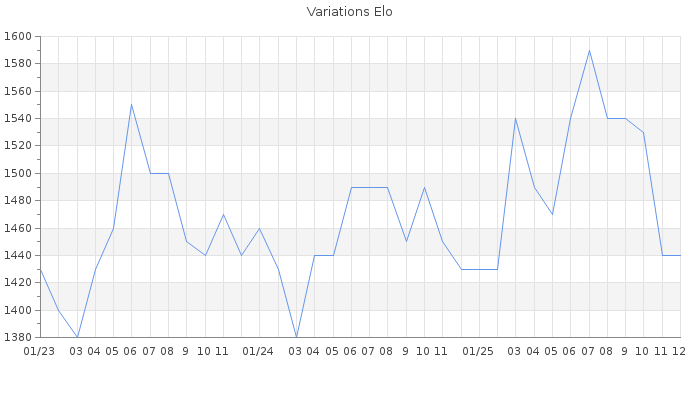 Date d'inscription : 09/03/18. Donateur pour EchecsEmail : Non ( Cliquez ici pour soutenir EchecsEmail. ) Elo non arrondi:1439 ( 390 sur 449 joueurs ) Nombre de victoires :423 Nombre de nulles :23 Nombre de défaites :503 Temps de réponse moyen par coup : 0J 19H 57M 18S ( Moyenne sur 547 coups ). Rd ( Un petit rd indique un elo fiable ) : 59 Elo maximum atteint ( en étant classé ) :1700 Elo maximum atteint cette année :1590 Nombre coups joués : 37130 Classement coupe : Inactif Points coupe : 0 Classement Coupe Magic Chess : Inactif Points Coupe Magic Chess : 0 Tournoi échelle : Tournois gagnés : 06/07/2025 : Cat 2 : Victoire dans le tournoi n°26815 05/03/2025 : Cat 2 : Victoire dans le tournoi n°26450 21/06/2024 : Cat 2 : Victoire dans le tournoi n°25836 21/08/2023 : Cat 2 : Victoire dans le tournoi n°25038 14/07/2023 : Cat 2 : Victoire dans le tournoi n°24924 24/05/2022 : Cat 2 : Victoire dans le tournoi n°23896 07/03/2022 : Cat 2 : Victoire dans le tournoi n°23653 20/01/2022 : Cat 2 : Victoire dans le tournoi n°23308 14/01/2022 : Cat 2 : Victoire dans le tournoi n°23510 25/10/2021 : Cat 2 : Victoire dans le tournoi n°23112 26/06/2021 : Cat 2 : Victoire dans le tournoi n°22834 29/06/2020 : Cat 2 : Victoire dans le tournoi n°21281 27/02/2020 : Cat 1 : Victoire dans le tournoi n°20678 04/07/2019 : Cat 2 : Victoire dans le tournoi n°19794 29/06/2019 : Cat 2 : Victoire dans le tournoi n°19450 04/09/2018 : Cat 2 : Victoire dans le tournoi n°18371 22/05/2018 : Cat 0 : Victoire dans le tournoi n°18095 Nombre de tournois gagnés :17