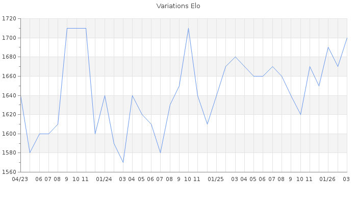 Date d'inscription : 21/05/20. Donateur pour EchecsEmail : Oui ( Cliquez ici pour soutenir EchecsEmail. ) Elo non arrondi:1698.5 ( 267 sur 442 joueurs ) Nombre de victoires :601 Nombre de nulles :220 Nombre de défaites :1012 Temps de réponse moyen par coup : 0J 5H 44M 16S ( Moyenne sur 1188 coups ). Rd ( Un petit rd indique un elo fiable ) : 60 Magic Elo:1700 Magic Rd : 350 Elo maximum atteint ( en étant classé ) :1790 Elo maximum atteint cette année :1700 Nombre coups joués : 63132 Inscrit dans l' équipe:Avalon Classement coupe : Inactif, date de la dernière qualification : 01/03/23 Points coupe : 110.49 Classement Coupe Magic Chess : Inactif Points Coupe Magic Chess : 0 Tournoi échelle : Inactif. Tournois gagnés : 18/05/2021 : Cat 2 : Victoire CC Mar21 Asc 07/01/2021 : Cat 3 : Victoire dans le tournoi n°21951 06/01/2021 : Cat 3 : Victoire dans le tournoi n°22226 20/10/2020 : Cat 2 : Victoire CC Sep20 Asc 09/08/2020 : Cat 2 : Victoire dans le tournoi n°21469 05/07/2020 : Cat 2 : Victoire CC Juin20 Asc 13/06/2020 : Cat 1 : Victoire dans le tournoi n°21320 Nombre de tournois gagnés :7