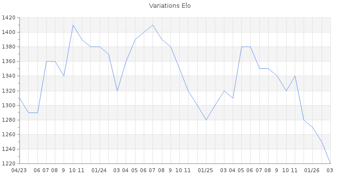 Date d'inscription : 28/03/20. Donateur pour EchecsEmail : Non ( Cliquez ici pour soutenir EchecsEmail. ) Elo non arrondi:1222.2 ( 423 sur 442 joueurs ) Nombre de victoires :314 Nombre de nulles :10 Nombre de défaites :582 Temps de réponse moyen par coup : 0J 3H 56M 15S ( Moyenne sur 1318 coups ). Rd ( Un petit rd indique un elo fiable ) : 58 Elo maximum atteint ( en étant classé ) :1470 Elo maximum atteint cette année :1290 Nombre coups joués : 33148 Classement coupe : Inactif Points coupe : 0 Classement Coupe Magic Chess : Inactif Points Coupe Magic Chess : 0 Tournoi échelle : Nombre de tournois gagnés :0