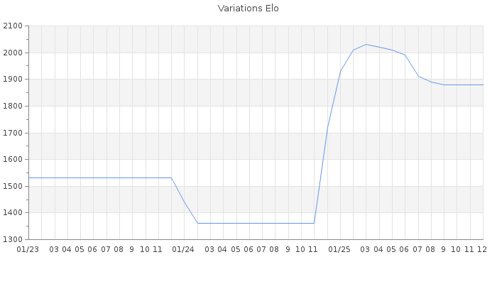 Date d'inscription : 09/12/19. Donateur pour EchecsEmail : Non ( Cliquez ici pour soutenir EchecsEmail. ) Elo non arrondi:1879.6 ( 191 sur 454 joueurs ) Nombre de victoires :166 Nombre de nulles :18 Nombre de défaites :157 Temps de réponse moyen par coup : 1J 3H 34M 11S ( Moyenne sur 54 coups ). Rd ( Un petit rd indique un elo fiable ) : 82 Magic Elo:1700 Magic Rd : 350 Elo maximum atteint ( en étant classé ) :2160 Elo maximum atteint cette année :2030 Nombre coups joués : 10006 Classement coupe : 125 Points coupe : 28.74 Classement Coupe Magic Chess : Inactif Points Coupe Magic Chess : 0 Tournoi échelle : Inactif. Tournois gagnés : 31/05/2025 : Cat 4 : Victoire dans le tournoi n°26503 24/05/2025 : Cat 4 : Victoire dans le tournoi n°26481 05/04/2025 : Cat 4 : Victoire dans le tournoi n°26453 01/04/2025 : Cat 4 : Victoire dans le tournoi n°26488 12/03/2025 : Cat 4 : Victoire dans le tournoi n°26463 21/02/2025 : Cat 3 : Victoire dans le tournoi n°26379 12/02/2025 : Cat 1 : Victoire dans le tournoi n°26253 28/01/2025 : Cat 4 : Victoire dans le tournoi n°26445 15/01/2025 : Cat 2 : Victoire dans le tournoi n°26366 15/01/2025 : Cat 2 : Victoire dans le tournoi n°26376 13/01/2025 : Cat 3 : Victoire dans le tournoi n°26378 28/12/2024 : Cat 1 : Victoire dans le tournoi n°26361 27/12/2024 : Cat 1 : Victoire dans le tournoi n°26352 24/12/2024 : Cat 1 : Victoire dans le tournoi n°26312 19/02/2022 : Cat 3 : Victoire dans le tournoi n°23476 10/02/2022 : Cat 4 : Victoire dans le tournoi n°23512 10/02/2022 : Cat 3 : Victoire dans le tournoi n°23463 10/02/2020 : Cat 4 : Victoire dans le tournoi n°20536 04/02/2020 : Cat 4 : Victoire dans le tournoi n°20552 09/01/2020 : Cat 4 : Victoire dans le tournoi n°20559 29/12/2019 : Cat 3 : Victoire dans le tournoi n°20546 Nombre de tournois gagnés :21