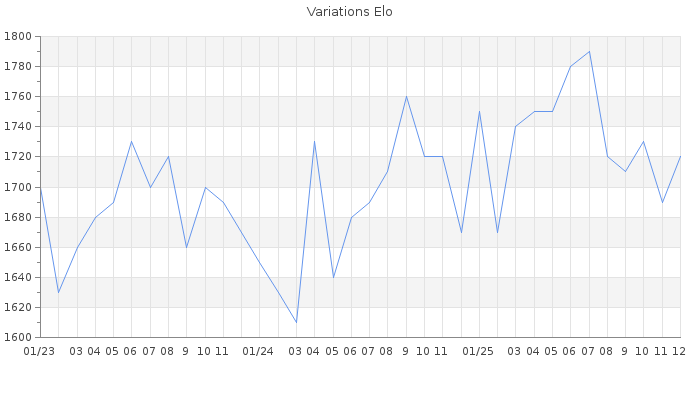 Date d'inscription : 15/03/12. Donateur pour EchecsEmail : Non ( Cliquez ici pour soutenir EchecsEmail. ) Elo non arrondi:1724.3 ( 262 sur 449 joueurs ) Nombre de victoires :6755 Nombre de nulles :1850 Nombre de défaites :7617 Temps de réponse moyen par coup : 0J 3H 18M 37S ( Moyenne sur 7917 coups ). Rd ( Un petit rd indique un elo fiable ) : 50 Magic Elo:1600 Magic Rd : 350 Elo maximum atteint ( en étant classé ) :1990 Elo maximum atteint cette année :1850 Nombre coups joués : 622906 Inscrit dans l' équipe:Royal Kids Classement coupe : 51 Points coupe : 485.99 Classement Coupe Magic Chess : Inactif Points Coupe Magic Chess : 0 Tournoi échelle : Inactif. Tournois gagnés : 25/11/2025 : Cat 3 : Victoire dans le tournoi n°27209 08/07/2025 : Cat 3 : Victoire dans le tournoi n°26848 23/06/2025 : Cat 3 : Victoire dans le tournoi n°26829 12/03/2025 : Cat 3 : Victoire dans le tournoi n°26549 28/01/2025 : Cat 2 : Victoire dans le tournoi n°26393 09/01/2025 : Cat 3 : Victoire dans le tournoi n°26085 16/11/2024 : Cat 2 : Victoire dans le tournoi n°25902 22/10/2024 : Cat 3 : Victoire dans le tournoi n°26154 15/10/2024 : Cat 3 : Victoire dans le tournoi n°26032 21/09/2024 : Cat 3 : Victoire dans le tournoi n°26106 29/08/2024 : Cat 2 : Victoire dans le tournoi n°25992 23/07/2024 : Cat 3 : Victoire dans le tournoi n°25910 07/07/2024 : Cat 2 : Victoire dans le tournoi n°25891 26/06/2024 : Cat 2 : Victoire dans le tournoi n°25853 22/04/2024 : Cat 2 : Victoire dans le tournoi n°25772 20/04/2024 : Cat 2 : Victoire dans le tournoi n°25751 05/04/2024 : Cat 2 : Victoire dans le tournoi n°25715 22/02/2024 : Cat 2 : Victoire dans le tournoi n°25618 16/02/2024 : Cat 3 : Victoire dans le tournoi n°25531 13/02/2024 : Cat 2 : Victoire dans le tournoi n°25451 25/01/2024 : Cat 2 : Victoire dans le tournoi n°25517 03/12/2023 : Cat 3 : Victoire dans le tournoi n°24922 25/08/2023 : Cat 3 : Victoire dans le tournoi n°25043 30/07/2023 : Cat 3 : Victoire dans le tournoi n°25091 23/05/2023 : Cat 2 : Victoire dans le tournoi n°24868 24/04/2023 : Cat 2 : Victoire dans le tournoi n°24829 22/04/2023 : Cat 2 : Victoire dans le tournoi n°24777 28/03/2023 : Cat 2 : Victoire dans le tournoi n°24743 15/03/2023 : Cat 2 : Victoire dans le tournoi n°24712 25/01/2023 : Cat 2 : Victoire dans le tournoi n°24588 22/01/2023 : Cat 2 : Victoire dans le tournoi n°24469 08/01/2023 : Cat 3 : Victoire dans le tournoi n°24501 26/12/2022 : Cat 3 : Victoire dans le tournoi n°24487 18/11/2022 : Cat 2 : Victoire dans le tournoi n°24421 23/10/2022 : Cat 2 : Victoire dans le tournoi n°24183 19/10/2022 : Cat 2 : Victoire dans le tournoi n°24335 10/09/2022 : Cat 3 : Victoire dans le tournoi n°24224 10/08/2022 : Cat 3 : Victoire dans le tournoi n°24143 26/07/2022 : Cat 3 : Victoire dans le tournoi n°24121 28/05/2022 : Cat 3 : Victoire dans le tournoi n°23959 30/03/2022 : Cat 2 : Victoire dans le tournoi n°23766 19/03/2022 : Cat 2 : Victoire dans le tournoi n°23664 08/02/2022 : Cat 2 : Victoire dans le tournoi n°23618 06/01/2022 : Cat 2 : Victoire dans le tournoi n°23399 05/01/2022 : Cat 2 : Victoire dans le tournoi n°23487 23/08/2021 : Cat 2 : Victoire dans le tournoi n°22636 15/08/2021 : Cat 3 : Victoire dans le tournoi n°22923 30/07/2021 : Cat 3 : Victoire dans le tournoi n°22952 09/07/2021 : Cat 2 : Victoire dans le tournoi n°22822 18/06/2021 : Cat 3 : Victoire dans le tournoi n°22685 17/06/2021 : Cat 3 : Victoire dans le tournoi n°22863 07/05/2021 : Cat 2 : Victoire dans le tournoi n°22654 19/04/2021 : Cat 2 : Victoire dans le tournoi n°22650 04/04/2021 : Cat 2 : Victoire dans le tournoi n°22599 17/03/2021 : Cat 2 : Victoire dans le tournoi n°22520 26/12/2020 : Cat 3 : Victoire dans le tournoi n°22011 02/10/2020 : Cat 3 : Victoire dans le tournoi n°21809 30/09/2020 : Cat 2 : Victoire dans le tournoi n°21764 22/08/2020 : Cat 2 : Victoire dans le tournoi n°21516 13/05/2020 : Cat 2 : Victoire dans le tournoi n°21242 06/05/2020 : Cat 2 : Victoire dans le tournoi n°21199 20/04/2020 : Cat 2 : Victoire dans le tournoi n°21074 08/04/2020 : Cat 2 : Victoire dans le tournoi n°20701 16/02/2020 : Cat 2 : Victoire dans le tournoi n°20749 14/12/2019 : Cat 2 : Victoire dans le tournoi n°20408 09/12/2019 : Cat 3 : Victoire dans le tournoi n°20497 14/10/2019 : Cat 3 : Victoire dans le tournoi n°20190 18/09/2019 : Cat 3 : Victoire dans le tournoi n°20127 13/09/2019 : Cat 3 : Victoire dans le tournoi n°20001 06/09/2019 : Cat 3 : Victoire dans le tournoi n°19903 02/05/2019 : Cat 2 : Victoire dans le tournoi n°19553 11/04/2019 : Cat 2 : Victoire dans le tournoi n°19390 09/04/2019 : Cat 2 : Victoire dans le tournoi n°19515 03/02/2019 : Cat 2 : Victoire dans le tournoi n°19216 10/01/2019 : Cat 2 : Victoire dans le tournoi n°19125 25/12/2018 : Cat 2 : Victoire dans le tournoi n°19097 19/12/2018 : Cat 2 : Victoire dans le tournoi n°19004 09/12/2018 : Cat 2 : Victoire dans le tournoi n°19016 30/11/2018 : Cat 2 : Victoire dans le tournoi n°18920 17/11/2018 : Cat 3 : Victoire dans le tournoi n°18908 28/10/2018 : Cat 2 : Victoire dans le tournoi n°18520 13/09/2018 : Cat 3 : Victoire dans le tournoi n°18615 11/09/2018 : Cat 3 : Victoire dans le tournoi n°18497 27/08/2018 : Cat 2 : Victoire dans le tournoi n°18442 20/06/2018 : Cat 2 : Victoire dans le tournoi n°18081 11/04/2018 : Cat 2 : Victoire dans le tournoi n°17718 07/03/2018 : Cat 2 : Victoire dans le tournoi n°17642 04/03/2018 : Cat 2 : Victoire dans le tournoi n°17433 07/12/2017 : Cat 2 : Victoire dans le tournoi n°17379 30/09/2017 : Cat 2 : Victoire dans le tournoi n°17074 20/09/2017 : Cat 2 : Victoire dans le tournoi n°17059 05/07/2017 : Cat 2 : Victoire dans le tournoi n°16697 04/07/2017 : Cat 2 : Victoire dans le tournoi n°16726 24/06/2017 : Cat 3 : Victoire dans le tournoi n°16530 20/06/2017 : Cat 2 : Victoire dans le tournoi n°16684 14/03/2017 : Cat 3 : Victoire dans le tournoi n°16050 10/01/2017 : Cat 2 : Victoire