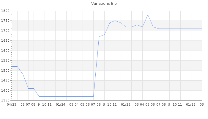 Date d'inscription : 16/05/08. Donateur pour EchecsEmail : Non ( Cliquez ici pour soutenir EchecsEmail. ) Elo non arrondi:1681.4 ( 291 sur 441 joueurs ) Nombre de victoires :385 Nombre de nulles :37 Nombre de défaites :462 Temps de réponse moyen par coup : 0J 13H 4M 26S ( Moyenne sur 6 coups ). Rd ( Un petit rd indique un elo fiable ) : 74 Magic Elo:1600 Magic Rd : 350 Elo maximum atteint ( en étant classé ) :1870 Elo maximum atteint cette année :0 Nombre coups joués : 31090 Classement coupe : Inactif Points coupe : 0 Classement Coupe Magic Chess : Inactif Points Coupe Magic Chess : 0 Tournoi échelle : Inactif. Nombre de tournois gagnés :0
