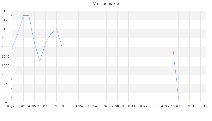 Date d'inscription : 28/05/18. Donateur pour EchecsEmail : Non ( Cliquez ici pour soutenir EchecsEmail. ) Elo non arrondi:1938.2 ( 162 sur 454 joueurs ) Nombre de victoires :99 Nombre de nulles :5 Nombre de défaites :56 Temps de réponse moyen par coup : 0J 4H 20M 45S ( Moyenne sur 7 coups ). Rd ( Un petit rd indique un elo fiable ) : 151 Magic Elo:1600 Magic Rd : 350 Elo maximum atteint ( en étant classé ) :2190 Elo maximum atteint cette année :0 Nombre coups joués : 4825 Classement coupe : Inactif Points coupe : 0 Classement Coupe Magic Chess : Inactif Points Coupe Magic Chess : 0 Tournoi échelle : Nombre de tournois gagnés :0
