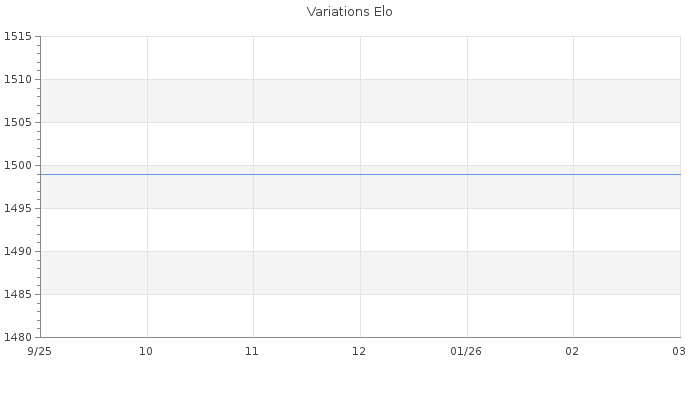 Date d'inscription : 28/09/25. Donateur pour EchecsEmail : Non ( Cliquez ici pour soutenir EchecsEmail. ) Elo non arrondi:1489 ( 375 sur 438 joueurs ) Nombre de victoires :0 Nombre de nulles :0 Nombre de défaites :0 Temps de réponse moyen par coup : 0J 0H 6M 40S ( Moyenne sur 0 coups ). Rd ( Un petit rd indique un elo fiable ) : 350 Elo maximum atteint ( en étant classé ) :0 Elo maximum atteint cette année :0 Nombre coups joués : 1 Classement coupe : Inactif Points coupe : 0 Classement Coupe Magic Chess : Inactif Points Coupe Magic Chess : 0 Tournoi échelle : Inactif. Nombre de tournois gagnés :0