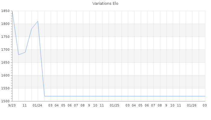 Date d'inscription : 01/09/23. Donateur pour EchecsEmail : Non ( Cliquez ici pour soutenir EchecsEmail. ) Elo non arrondi:1486.9 ( 420 sur 442 joueurs ) Nombre de victoires :62 Nombre de nulles :7 Nombre de défaites :111 Temps de réponse moyen par coup : 0J 18H 15M 43S ( Moyenne sur 0 coups ). Rd ( Un petit rd indique un elo fiable ) : 50 Elo maximum atteint ( en étant classé ) :2050 Elo maximum atteint cette année :0 Nombre coups joués : 4722 Classement coupe : Inactif, date de la dernière qualification : 04/01/24 Points coupe : 17.31 Classement Coupe Magic Chess : Inactif Points Coupe Magic Chess : 0 Tournoi échelle : Inactif. Tournois gagnés : 31/12/2023 : Cat 3 : Victoire dans le tournoi n°25425 07/12/2023 : Cat 2 : Premier au tournoi multi Halloween 2023 n°2 Nombre de tournois gagnés :3