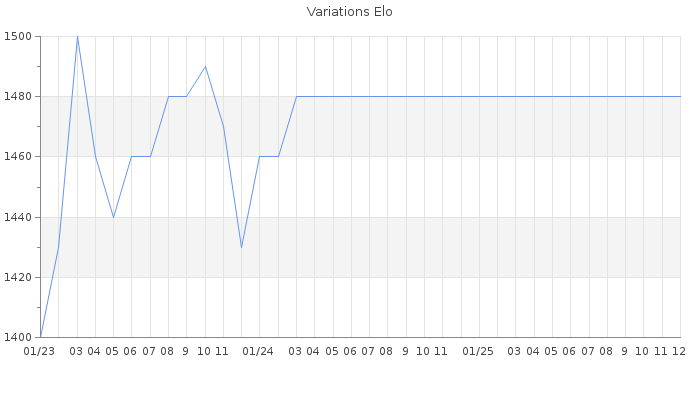 Date d'inscription : 02/07/21. Donateur pour EchecsEmail : Non ( Cliquez ici pour soutenir EchecsEmail. ) Elo non arrondi:1456.6 ( 428 sur 458 joueurs ) Nombre de victoires :23 Nombre de nulles :1 Nombre de défaites :27 Temps de réponse moyen par coup : 0J 19H 40M 31S ( Moyenne sur 0 coups ). Rd ( Un petit rd indique un elo fiable ) : 112 Elo maximum atteint ( en étant classé ) :1500 Elo maximum atteint cette année :0 Nombre coups joués : 2174 Classement coupe : Inactif Points coupe : 0 Classement Coupe Magic Chess : Inactif Points Coupe Magic Chess : 0 Tournoi échelle : Nombre de tournois gagnés :0