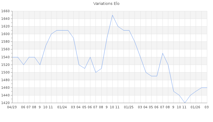 Date d'inscription : 23/10/15. Donateur pour EchecsEmail : Non ( Cliquez ici pour soutenir EchecsEmail. ) Elo non arrondi:1456.1 ( 370 sur 441 joueurs ) Nombre de victoires :1608 Nombre de nulles :348 Nombre de défaites :3479 Temps de réponse moyen par coup : 0J 6H 29M 25S ( Moyenne sur 849 coups ). Rd ( Un petit rd indique un elo fiable ) : 58 Elo maximum atteint ( en étant classé ) :1690 Elo maximum atteint cette année :1490 Nombre coups joués : 187531 Classement coupe : Inactif Points coupe : 4.77 Classement Coupe Magic Chess : Inactif Points Coupe Magic Chess : 0 Tournoi échelle : Inactif. Tournois gagnés : 29/10/2024 : Cat 2 : Victoire dans le tournoi n°26019 15/10/2024 : Cat 2 : Victoire dans le tournoi n°26074 20/02/2024 : Cat 2 : Victoire dans le tournoi n°25528 01/11/2023 : Cat 2 : Victoire dans le tournoi n°25263 04/08/2022 : Cat 2 : Victoire dans le tournoi n°24061 01/08/2022 : Cat 2 : Victoire dans le tournoi n°24034 28/06/2022 : Cat 2 : Victoire dans le tournoi n°24003 21/11/2021 : Cat 2 : Victoire dans le tournoi n°23345 28/07/2021 : Cat 2 : Victoire dans le tournoi n°22853 07/07/2021 : Cat 2 : Victoire dans le tournoi n°22787 15/06/2021 : Cat 1 : Victoire dans le tournoi n°22707 01/02/2021 : Cat 2 : Victoire dans le tournoi n°21987 01/11/2020 : Cat 2 : Victoire dans le tournoi n°21941 28/10/2020 : Cat 2 : Victoire dans le tournoi n°21895 28/06/2019 : Cat 2 : Victoire dans le tournoi n°19732 03/06/2019 : Cat 1 : Victoire dans le tournoi n°19584 20/12/2018 : Cat 1 : Victoire dans le tournoi n°19078 16/03/2018 : Cat 1 : Victoire dans le tournoi n°17548 12/03/2018 : Cat 1 : Victoire dans le tournoi n°17765 10/01/2018 : Cat 1 : Victoire dans le tournoi n°17431 08/06/2017 : Cat 2 : Victoire dans le tournoi n°16559 10/04/2017 : Cat 1 : Victoire dans le tournoi n°16376 24/11/2016 : Cat 1 : Victoire dans le tournoi n°15670 Nombre de tournois gagnés :23