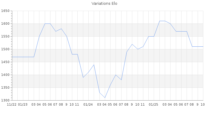 Date d'inscription : 07/11/20. Donateur pour EchecsEmail : Non ( Cliquez ici pour soutenir EchecsEmail. ) Elo non arrondi:1507.3 ( 367 sur 452 joueurs ) Nombre de victoires :386 Nombre de nulles :47 Nombre de défaites :415 Temps de réponse moyen par coup : 0J 11H 17M 26S ( Moyenne sur 129 coups ). Rd ( Un petit rd indique un elo fiable ) : 62 Magic Elo:1700 Magic Rd : 350 Elo maximum atteint ( en étant classé ) :1660 Elo maximum atteint cette année :1660 Nombre coups joués : 28191 Inscrit dans l' équipe:les accrocheurs Classement coupe : Inactif Points coupe : 1.32 Classement Coupe Magic Chess : Inactif Points Coupe Magic Chess : 0 Tournoi échelle : Inactif. Tournois gagnés : 27/03/2025 : Cat 2 : Victoire dans le tournoi n°26508 17/02/2025 : Cat 2 : Victoire dans le tournoi n°26435 17/01/2025 : Cat 2 : Victoire dans le tournoi n°26296 15/01/2025 : Cat 2 : Victoire dans le tournoi n°26321 23/12/2024 : Cat 1 : Victoire dans le tournoi n°26190 04/11/2024 : Cat 1 : Victoire dans le tournoi n°26064 26/09/2024 : Cat 1 : Victoire dans le tournoi n°26045 03/09/2024 : Cat 2 : Victoire dans le tournoi n°26025 19/05/2024 : Cat 1 : Victoire dans le tournoi n°25756 28/07/2023 : Cat 2 : Victoire dans le tournoi n°24998 16/07/2023 : Cat 2 : Victoire dans le tournoi n°24963 20/05/2023 : Cat 2 : Victoire dans le tournoi n°24806 18/05/2023 : Cat 1 : Victoire dans le tournoi n°24757 02/04/2022 : Cat 2 : Victoire dans le tournoi n°23737 11/03/2022 : Cat 1 : Victoire dans le tournoi n°23713 11/03/2022 : Cat 1 : Victoire dans le tournoi n°23696 18/04/2021 : Cat 1 : Victoire dans le tournoi n°22438 04/01/2021 : Cat 1 : Victoire dans le tournoi n°22031 Nombre de tournois gagnés :18