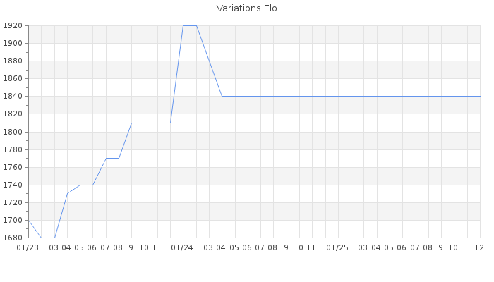 Date d'inscription : 04/11/12. Donateur pour EchecsEmail : Non ( Cliquez ici pour soutenir EchecsEmail. ) Elo non arrondi:1811.9 ( 231 sur 460 joueurs ) Nombre de victoires :192 Nombre de nulles :19 Nombre de défaites :188 Temps de réponse moyen par coup : 1J 9H 37M 18S ( Moyenne sur 1 coups ). Rd ( Un petit rd indique un elo fiable ) : 117 Magic Elo:1600 Magic Rd : 350 Elo maximum atteint ( en étant classé ) :1920 Elo maximum atteint cette année :0 Nombre coups joués : 19813 Inscrit dans l' équipe:Ardeche terre d audace Classement coupe : Inactif Points coupe : 0 Classement Coupe Magic Chess : Inactif Points Coupe Magic Chess : 0 Tournoi échelle : Inactif. Tournois gagnés : 19/03/2019 : Cat 2 : Victoire dans le tournoi n°19015 02/09/2017 : Cat 2 : Victoire dans le tournoi n°16836 08/04/2016 : Cat 2 : Victoire dans le tournoi n°14346 08/01/2014 : Cat 2 : Victoire dans le tournoi n°14103 18/02/2013 : Cat 1 : Victoire dans le tournoi n°11677 Nombre de tournois gagnés :5