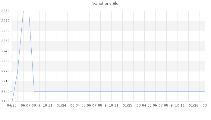 Date d'inscription : 01/11/22. Donateur pour EchecsEmail : Non ( Cliquez ici pour soutenir EchecsEmail. ) Elo non arrondi:2153.4 ( 49 sur 441 joueurs ) Nombre de victoires :60 Nombre de nulles :9 Nombre de défaites :4 Temps de réponse moyen par coup : 0J 7H 4M 47S ( Moyenne sur 0 coups ). Rd ( Un petit rd indique un elo fiable ) : 80 Magic Elo:1700 Magic Rd : 350 Elo maximum atteint ( en étant classé ) :2280 Elo maximum atteint cette année :0 Nombre coups joués : 2291 Classement coupe : Inactif, date de la dernière qualification : 24/01/23 Points coupe : 2.4 Classement Coupe Magic Chess : Inactif Points Coupe Magic Chess : 0 Tournoi échelle : Inactif. Nombre de tournois gagnés :0