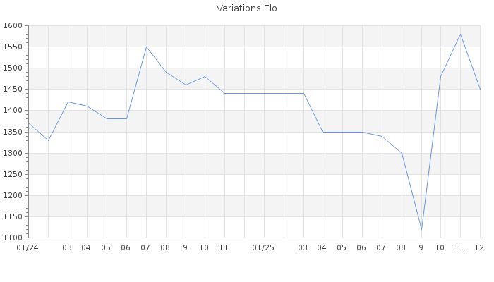 Date d'inscription : 13/01/24. Donateur pour EchecsEmail : Non ( Cliquez ici pour soutenir EchecsEmail. ) Elo non arrondi:1447.3 ( 388 sur 460 joueurs ) Nombre de victoires :499 Nombre de nulles :30 Nombre de défaites :906 Temps de réponse moyen par coup : 0J 3H 56M 51S ( Moyenne sur 13506 coups ). Rd ( Un petit rd indique un elo fiable ) : 50 Magic Elo:1700 Magic Rd : 350 Elo maximum atteint ( en étant classé ) :1600 Elo maximum atteint cette année :1600 Nombre coups joués : 51366 Inscrit dans l' équipe:fouschess Classement coupe : 86 Points coupe : 164.79 Classement Coupe Magic Chess : Inactif Points Coupe Magic Chess : 0 Tournoi échelle : Tournois gagnés : 18/11/2025 : Cat 1 : Victoire dans le tournoi n°27201 Nombre de tournois gagnés :1