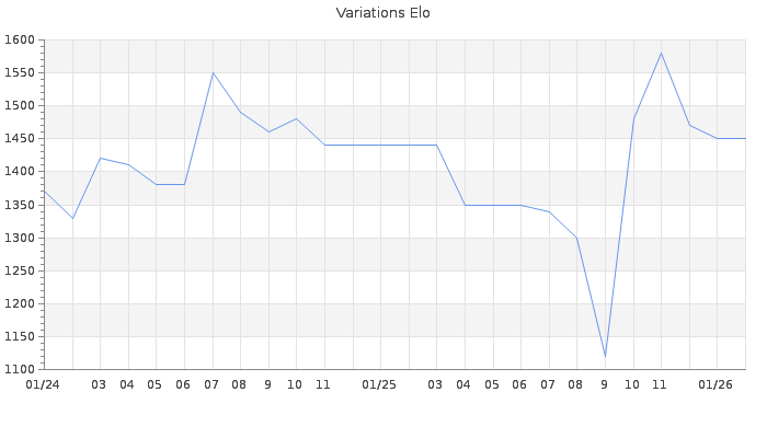 Date d'inscription : 13/01/24. Donateur pour EchecsEmail : Non ( Cliquez ici pour soutenir EchecsEmail. ) Elo non arrondi:1453.4 ( 385 sur 458 joueurs ) Nombre de victoires :630 Nombre de nulles :33 Nombre de défaites :1116 Temps de réponse moyen par coup : 0J 2H 50M 15S ( Moyenne sur 15412 coups ). Rd ( Un petit rd indique un elo fiable ) : 50 Magic Elo:1700 Magic Rd : 350 Elo maximum atteint ( en étant classé ) :1600 Elo maximum atteint cette année :1510 Nombre coups joués : 64477 Inscrit dans l' équipe:fouschess Classement coupe : 78 Points coupe : 187.16 Classement Coupe Magic Chess : Inactif Points Coupe Magic Chess : 0 Tournoi échelle : Tournois gagnés : 30/12/2025 : Cat 1 : Victoire dans le tournoi n°27152 28/12/2025 : Cat 1 : Victoire dans le tournoi n°27309 18/11/2025 : Cat 1 : Victoire dans le tournoi n°27201 Nombre de tournois gagnés :3