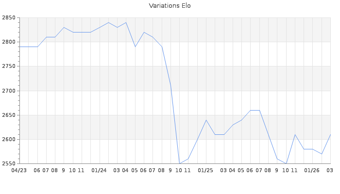 Date d'inscription : 21/04/20. Donateur pour EchecsEmail : Non ( Cliquez ici pour soutenir EchecsEmail. ) Elo non arrondi:2611.5 ( 18 sur 441 joueurs ) Nombre de victoires :299 Nombre de nulles :260 Nombre de défaites :51 Temps de réponse moyen par coup : 0J 17H 24M 10S ( Moyenne sur 226 coups ). Rd ( Un petit rd indique un elo fiable ) : 77 Magic Elo:1700 Magic Rd : 350 Elo maximum atteint ( en étant classé ) :2860 Elo maximum atteint cette année :2610 Nombre coups joués : 18900 Classement coupe : 1 Points coupe : 39989.3 Classement Coupe Magic Chess : Inactif Points Coupe Magic Chess : 0 Tournoi échelle : Inactif. Nombre de tournois gagnés :0