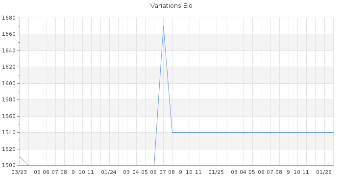 Date d'inscription : 30/10/21. Donateur pour EchecsEmail : Non ( Cliquez ici pour soutenir EchecsEmail. ) Elo non arrondi:1509.9 ( 377 sur 463 joueurs ) Nombre de victoires :591 Nombre de nulles :79 Nombre de défaites :676 Temps de réponse moyen par coup : 0J 9H 20M 29S ( Moyenne sur 0 coups ). Rd ( Un petit rd indique un elo fiable ) : 50 Magic Elo:1700 Magic Rd : 350 Elo maximum atteint ( en étant classé ) :1990 Elo maximum atteint cette année :0 Nombre coups joués : 46863 Classement coupe : Inactif, date de la dernière qualification : 02/08/24 Points coupe : 130.44 Classement Coupe Magic Chess : Inactif Points Coupe Magic Chess : 0 Tournoi échelle : Inactif. Tournois gagnés : 08/09/2024 : Cat 2 : Victoire dans le tournoi n°25938 05/03/2023 : Cat 4 : Victoire dans le tournoi n°24351 11/11/2022 : Cat 3 : Victoire CC Sep22 Asc 20/08/2022 : Cat 2 : Victoire CC Juil22 Asc 02/08/2022 : Cat 3 : Victoire CC Mai22 Asc 02/08/2022 : Cat 3 : Victoire dans le tournoi n°23958 19/06/2022 : Cat 4 : Victoire dans le tournoi n°23977 06/05/2022 : Cat 4 : Victoire dans le tournoi n°23799 15/04/2022 : Cat 3 : Victoire dans le tournoi n°23718 29/03/2022 : Cat 2 : Victoire dans le tournoi n°23616 25/03/2022 : Cat 3 : Victoire CC Jan22 Asc 23/03/2022 : Cat 3 : Victoire dans le tournoi n°23605 21/03/2022 : Cat 2 : Victoire dans le tournoi n°23607 08/03/2022 : Cat 4 : Victoire dans le tournoi n°23412 05/02/2022 : Cat 3 : Victoire CC Dec21 Asc 26/11/2021 : Cat 3 : Victoire dans le tournoi n°23321 Nombre de tournois gagnés :16