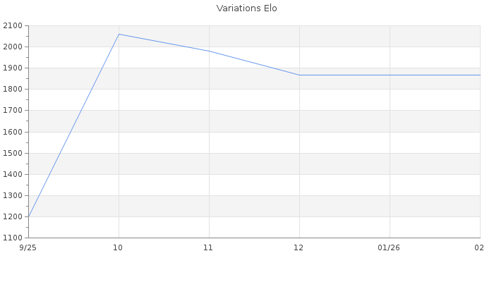 Date d'inscription : 18/09/25. Donateur pour EchecsEmail : Non ( Cliquez ici pour soutenir EchecsEmail. ) Elo non arrondi:1865.3 ( 199 sur 463 joueurs ) Nombre de victoires :4 Nombre de nulles :0 Nombre de défaites :2 Temps de réponse moyen par coup : 0J 21H 23M 39S ( Moyenne sur 38 coups ). Rd ( Un petit rd indique un elo fiable ) : 158 Elo maximum atteint ( en étant classé ) :0 Elo maximum atteint cette année :0 Nombre coups joués : 150 Classement coupe : Inactif Points coupe : 0 Classement Coupe Magic Chess : Inactif Points Coupe Magic Chess : 0 Tournoi échelle : Nombre de tournois gagnés :0