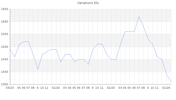 Date d'inscription : 26/11/12. Donateur pour EchecsEmail : Non ( Cliquez ici pour soutenir EchecsEmail. ) Elo non arrondi:1362.7 ( 416 sur 458 joueurs ) Nombre de victoires :440 Nombre de nulles :28 Nombre de défaites :565 Temps de réponse moyen par coup : 1J 1H 18M 9S ( Moyenne sur 291 coups ). Rd ( Un petit rd indique un elo fiable ) : 78 Magic Elo:1600 Magic Rd : 350 Elo maximum atteint ( en étant classé ) :1690 Elo maximum atteint cette année :1440 Nombre coups joués : 36862 Classement coupe : Inactif Points coupe : 0 Classement Coupe Magic Chess : Inactif Points Coupe Magic Chess : 0 Tournoi échelle : Inactif. Tournois gagnés : 29/12/2012 : Cat 1 : Victoire dans le tournoi n°11461 10/12/2012 : Cat 0 : Victoire dans le tournoi n°11274 Nombre de tournois gagnés :2
