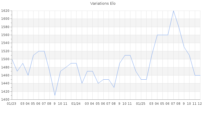 Date d'inscription : 26/11/12. Donateur pour EchecsEmail : Non ( Cliquez ici pour soutenir EchecsEmail. ) Elo non arrondi:1459 ( 381 sur 448 joueurs ) Nombre de victoires :440 Nombre de nulles :28 Nombre de défaites :557 Temps de réponse moyen par coup : 0J 17H 23M 26S ( Moyenne sur 265 coups ). Rd ( Un petit rd indique un elo fiable ) : 71 Magic Elo:1600 Magic Rd : 350 Elo maximum atteint ( en étant classé ) :1690 Elo maximum atteint cette année :1620 Nombre coups joués : 36555 Classement coupe : Inactif Points coupe : 0 Classement Coupe Magic Chess : Inactif Points Coupe Magic Chess : 0 Tournoi échelle : Inactif. Tournois gagnés : 29/12/2012 : Cat 1 : Victoire dans le tournoi n°11461 10/12/2012 : Cat 0 : Victoire dans le tournoi n°11274 Nombre de tournois gagnés :2