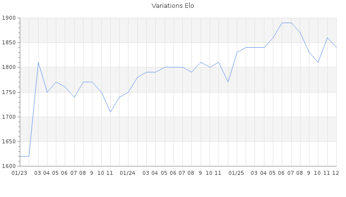 Date d'inscription : Avant le 20/12/05. Donateur pour EchecsEmail : Oui ( Cliquez ici pour soutenir EchecsEmail. ) Elo non arrondi:1839.6 ( 210 sur 452 joueurs ) Nombre de victoires :639 Nombre de nulles :232 Nombre de défaites :691 Temps de réponse moyen par coup : 0J 8H 56M 54S ( Moyenne sur 300 coups ). Rd ( Un petit rd indique un elo fiable ) : 79 Magic Elo:1600 Magic Rd : 350 Elo maximum atteint ( en étant classé ) :1890 Elo maximum atteint cette année :1890 Nombre coups joués : 27775 Inscrit dans l' équipe:au plaisir du jeux Classement coupe : 140 Points coupe : 15.12 Classement Coupe Magic Chess : Inactif Points Coupe Magic Chess : 0 Tournoi échelle : Inactif. Tournois gagnés : 08/05/2025 : Cat 3 : Victoire dans le tournoi n°26514 12/08/2023 : Cat 2 : Premier au tournoi multi Printemps 2023 n°1 01/04/2023 : Cat 1 : Premier au tournoi multi Printemps 2023 n°2 26/03/2023 : Cat 2 : Victoire dans le tournoi n°24704 08/05/2020 : Cat 2 : Victoire dans le tournoi n°21120 08/11/2016 : Cat 2 : Victoire dans le tournoi n°15491 18/01/2016 : Cat 1 : Victoire dans le tournoi n°18952 22/12/2014 : Cat 0 : Premier au tournoi multi Halloween 2014 n°8 01/05/2010 : Cat 2 : Victoire dans le tournoi n°7117 29/03/2010 : Cat 2 : Victoire dans le tournoi n°7158 08/11/2009 : Cat 2 : Victoire dans le tournoi n°6562 26/10/2009 : Cat 2 : Victoire dans le tournoi n°6515 10/08/2009 : Cat 0 : Premier au tournoi multi Eté 2009 n°3 17/06/2009 : Cat 2 : Victoire dans le tournoi n°5786 27/05/2009 : Cat 0 : Premier au tournoi multi Printemps 2009 n°5 05/03/2008 : Cat 2 : Victoire dans le tournoi n°4553 10/02/2008 : Cat 0 : Premier au tournoi multi Automne 2007 n°1 24/12/2007 : Cat 2 : Victoire dans le tournoi n°4560 20/11/2007 : Cat 0 : Premier au tournoi multi Automne 2007 n°4 20/07/2007 : Cat 0 : Victoire dans le tournoi n°4131 11/12/2006 : Cat 0 : Premier au tournoi multi Automne 2006 n°5 18/10/2006 : Cat 0 : Premier au tournoi multi Automne 2006 n°20 27/06/2006 : Cat 0 : Victoire dans le tournoi n°2930 07/04/2006 : Cat 0 : Victoire dans le tournoi n°2723 14/03/2006 : Cat 0 : Victoire dans le tournoi n°2593 05/02/2006 : Cat 0 : Victoire dans le tournoi n°2427 15/11/2005 : Cat 0 : Victoire dans le tournoi n°1806 31/03/2005 : Cat 0 : Victoire dans le tournoi n°1307 19/03/2005 : Cat 0 : Victoire dans le tournoi n°1328 19/02/2005 : Cat 0 : Victoire dans le tournoi n°1154 28/06/2004 : Cat 0 : Victoire dans le tournoi n°756 13/03/2004 : Cat 0 : Victoire dans le tournoi n°625 31/08/2003 : Cat 0 : Victoire dans le tournoi n°459 25/01/2003 : Cat 0 : Victoire dans le tournoi n°200 07/01/2003 : Cat 0 : Victoire dans le tournoi n°200 Nombre de tournois gagnés :37