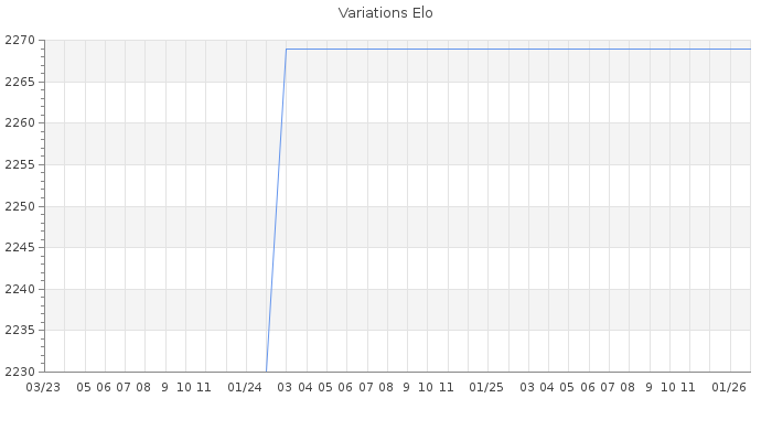 Date d'inscription : 21/10/11. Donateur pour EchecsEmail : Non ( Cliquez ici pour soutenir EchecsEmail. ) Elo non arrondi:2235.4 ( 58 sur 459 joueurs ) Nombre de victoires :225 Nombre de nulles :21 Nombre de défaites :101 Temps de réponse moyen par coup : 0J 1H 19M 12S ( Moyenne sur 0 coups ). Rd ( Un petit rd indique un elo fiable ) : 218 Elo maximum atteint ( en étant classé ) :2540 Elo maximum atteint cette année :0 Nombre coups joués : 14491 Classement coupe : Inactif Points coupe : 0 Classement Coupe Magic Chess : Inactif Points Coupe Magic Chess : 0 Tournoi échelle : Tournois gagnés : 04/06/2012 : Cat 5 : Victoire dans le tournoi n°10375 20/05/2012 : Cat 5 : Victoire dans le tournoi n°10332 13/05/2012 : Cat 5 : Victoire dans le tournoi n°10306 30/04/2012 : Cat 5 : Victoire dans le tournoi n°10237 23/04/2012 : Cat 4 : Victoire dans le tournoi n°10229 21/04/2012 : Cat 4 : Victoire dans le tournoi n°10217 20/04/2012 : Cat 3 : Victoire dans le tournoi n°10188 31/03/2012 : Cat 3 : Victoire dans le tournoi n°10038 08/12/2011 : Cat 4 : Victoire dans le tournoi n°9464 06/11/2011 : Cat 3 : Victoire dans le tournoi n°9385 25/10/2011 : Cat 2 : Victoire dans le tournoi n°9346 Nombre de tournois gagnés :11