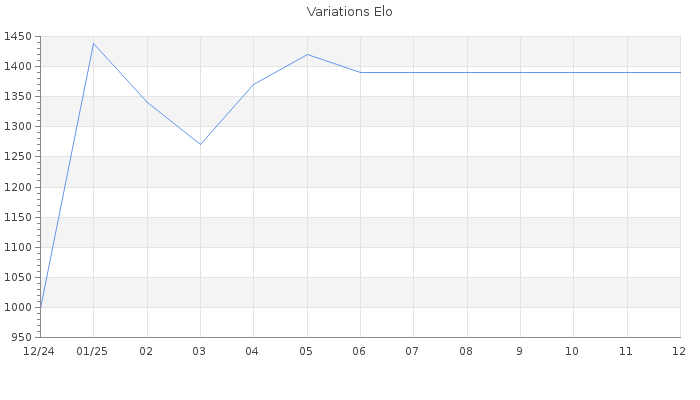 Date d'inscription : 30/12/24. Donateur pour EchecsEmail : Non ( Cliquez ici pour soutenir EchecsEmail. ) Elo non arrondi:1369.5 ( 437 sur 449 joueurs ) Nombre de victoires :10 Nombre de nulles :0 Nombre de défaites :11 Temps de réponse moyen par coup : 0J 12H 53M 3S ( Moyenne sur 11 coups ). Rd ( Un petit rd indique un elo fiable ) : 99 Elo maximum atteint ( en étant classé ) :1420 Elo maximum atteint cette année :1420 Nombre coups joués : 629 Classement coupe : Inactif Points coupe : 0 Classement Coupe Magic Chess : Inactif Points Coupe Magic Chess : 0 Tournoi échelle : Nombre de tournois gagnés :0