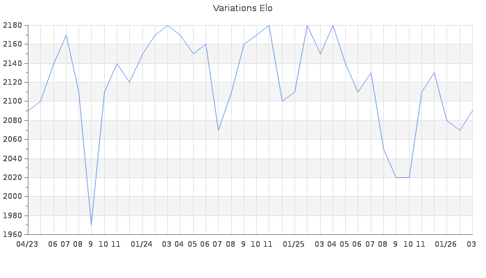 Date d'inscription : 16/03/06. Donateur pour EchecsEmail : Non ( Cliquez ici pour soutenir EchecsEmail. ) Elo non arrondi:2085.5 ( 91 sur 444 joueurs ) Nombre de victoires :3487 Nombre de nulles :622 Nombre de défaites :2252 Temps de réponse moyen par coup : 0J 1H 37M 47S ( Moyenne sur 8950 coups ). Rd ( Un petit rd indique un elo fiable ) : 50 Magic Elo:2018.87 Magic Rd : 80 Elo maximum atteint ( en étant classé ) :2380 Elo maximum atteint cette année :2140 Nombre coups joués : 224345 Inscrit dans l' équipe:cotenstock Classement coupe : 6 Points coupe : 15000.3 Classement Coupe Magic Chess : 4 Points Coupe Magic Chess : 308.1 Tournoi échelle : Elite : 1 Tournois gagnés : 28/02/2026 : Cat 3 : Victoire CC Fev26 01/01/2026 : Cat 4 : Premier au tournoi multi Noël 2025 n°3 31/12/2025 : Cat 4 : Victoire dans le tournoi n°27305 17/12/2025 : Cat 3 : Victoire CC Dec25 21/11/2025 : Cat 4 : Victoire dans le tournoi n°27207 18/11/2025 : Cat 4 : Victoire dans le tournoi n°27175 13/11/2025 : Cat 4 : Victoire dans le tournoi n°27164 07/08/2025 : Cat 5 : Victoire dans le tournoi n°26908 17/07/2025 : Cat 5 : Victoire dans le tournoi n°26725 03/07/2025 : Cat 5 : Victoire dans le tournoi n°26745 03/07/2025 : Cat 5 : Victoire dans le tournoi n°26668 14/05/2025 : Cat 5 : Victoire dans le tournoi n°26671 21/04/2025 : Cat 4 : Victoire CC Avr25 29/01/2025 : Cat 5 : Victoire dans le tournoi n°26385 04/01/2025 : Cat 5 : Victoire dans le tournoi n°26100 03/11/2024 : Cat 5 : Victoire dans le tournoi n°26028 09/04/2024 : Cat 4 : Victoire CC Jan24 Asc 27/11/2023 : Cat 3 : Victoire CC Nov23 14/11/2023 : Cat 5 : Victoire dans le tournoi n°25272 03/11/2023 : Cat 5 : Victoire dans le tournoi n°25310 03/11/2023 : Cat 5 : Victoire dans le tournoi n°25265 16/10/2023 : Cat 4 : Victoire dans le tournoi n°25261 12/10/2023 : Cat 4 : Victoire dans le tournoi n°25262 21/08/2023 : Cat 5 : Victoire dans le tournoi n°25029 07/07/2023 : Cat 5 : Victoire dans le tournoi n°24957 19/09/2022 : Cat 4 : Victoire CC Juil22 Asc 19/09/2022 : Cat 4 : Victoire CC Juil22 Asc 09/09/2022 : Cat 4 : Victoire CC Juin22 16/05/2022 : Cat 5 : Victoire dans le tournoi n°23914 28/03/2022 : Cat 5 : Victoire dans le tournoi n°23741 04/07/2019 : Cat 5 : Victoire dans le tournoi n°19634 20/09/2018 : Cat 5 : Victoire dans le tournoi n°18310 14/02/2018 : Cat 5 : Victoire dans le tournoi n°17491 16/12/2017 : Cat 5 : Victoire dans le tournoi n°17327 30/06/2017 : Cat 5 : Victoire dans le tournoi n°16297 21/08/2016 : Cat 5 : Victoire dans le tournoi n°14979 15/08/2015 : Cat 6 : Victoire dans le tournoi n°17687 02/06/2015 : Cat 5 : Victoire dans le tournoi n°17481 20/05/2015 : Cat 6 : Victoire dans le tournoi n°17229 30/03/2014 : Cat 5 : Victoire dans le tournoi n°14606 05/10/2012 : Cat 5 : Victoire dans le tournoi n°10563 01/06/2012 : Cat 5 : Victoire dans le tournoi n°10115 30/06/2011 : Cat 5 : Victoire dans le tournoi n°8528 31/01/2011 : Cat 5 : Victoire dans le tournoi n°8100 19/10/2010 : Cat 5 : Victoire dans le tournoi n°7719 07/06/2010 : Cat 5 : Victoire dans le tournoi n°7088 31/03/2010 : Cat 5 : Victoire dans le tournoi n°6543 10/09/2009 : Cat 4 : Victoire dans le tournoi n°6027 30/01/2008 : Cat 4 : Victoire dans le tournoi n°4462 14/02/2007 : Cat 3 : Victoire dans le tournoi n°3609 18/12/2006 : Cat 3 : Victoire dans le tournoi n°3618 Nombre de tournois gagnés :52