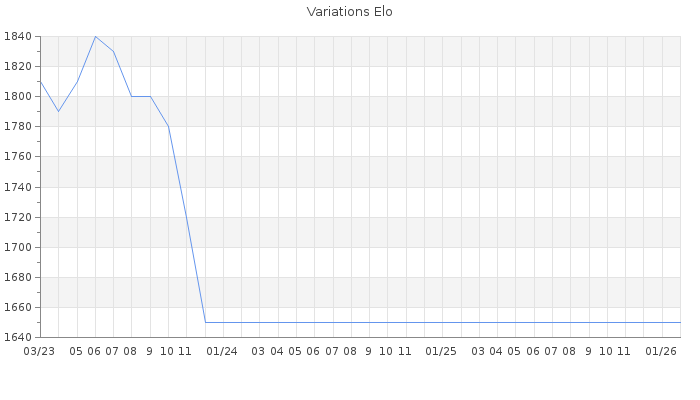 Date d'inscription : 01/10/13. Donateur pour EchecsEmail : Non ( Cliquez ici pour soutenir EchecsEmail. ) Elo non arrondi:1620.7 ( 346 sur 459 joueurs ) Nombre de victoires :454 Nombre de nulles :92 Nombre de défaites :520 Temps de réponse moyen par coup : 0J 17H 47M 30S ( Moyenne sur 0 coups ). Rd ( Un petit rd indique un elo fiable ) : 69 Magic Elo:1600 Magic Rd : 350 Elo maximum atteint ( en étant classé ) :1950 Elo maximum atteint cette année :0 Nombre coups joués : 46610 Classement coupe : Inactif Points coupe : 0 Classement Coupe Magic Chess : Inactif Points Coupe Magic Chess : 0 Tournoi échelle : Nombre de tournois gagnés :0