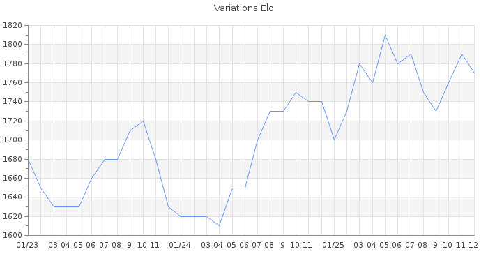 Date d'inscription : 23/02/10. Donateur pour EchecsEmail : Non ( Cliquez ici pour soutenir EchecsEmail. ) Elo non arrondi:1765.3 ( 238 sur 448 joueurs ) Nombre de victoires :409 Nombre de nulles :39 Nombre de défaites :327 Temps de réponse moyen par coup : 0J 12H 39M 15S ( Moyenne sur 422 coups ). Rd ( Un petit rd indique un elo fiable ) : 76 Magic Elo:1600 Magic Rd : 350 Elo maximum atteint ( en étant classé ) :1910 Elo maximum atteint cette année :1810 Nombre coups joués : 29349 Classement coupe : Inactif Points coupe : 0.03 Classement Coupe Magic Chess : Inactif Points Coupe Magic Chess : 0 Tournoi échelle : Inactif. Tournois gagnés : 03/04/2016 : Cat 3 : Victoire dans le tournoi n°14447 18/07/2015 : Cat 2 : Victoire dans le tournoi n°17666 29/10/2014 : Cat 3 : Victoire dans le tournoi n°15750 05/06/2013 : Cat 2 : Victoire dans le tournoi n°12584 21/02/2013 : Cat 2 : Victoire dans le tournoi n°11664 Nombre de tournois gagnés :5