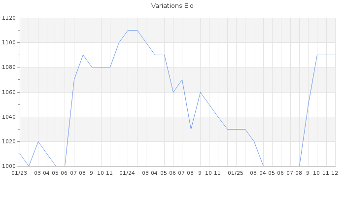 Date d'inscription : 15/10/19. Donateur pour EchecsEmail : Non ( Cliquez ici pour soutenir EchecsEmail. ) Elo non arrondi:1088.6 ( 444 sur 449 joueurs ) Nombre de victoires :77 Nombre de nulles :11 Nombre de défaites :1772 Temps de réponse moyen par coup : 0J 14H 11M 53S ( Moyenne sur 49 coups ). Rd ( Un petit rd indique un elo fiable ) : 114 Magic Elo:1267.58 Magic Rd : 312 Elo maximum atteint ( en étant classé ) :1130 Elo maximum atteint cette année :1090 Nombre coups joués : 56972 Classement coupe : Inactif Points coupe : 0 Classement Coupe Magic Chess : Inactif Points Coupe Magic Chess : 0 Tournoi échelle : Nombre de tournois gagnés :0