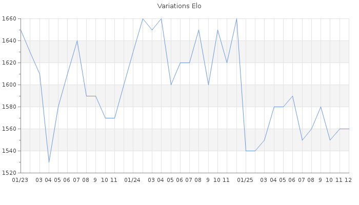 Date d'inscription : 13/10/14. Donateur pour EchecsEmail : Non ( Cliquez ici pour soutenir EchecsEmail. ) Elo non arrondi:1559.2 ( 340 sur 448 joueurs ) Nombre de victoires :1479 Nombre de nulles :242 Nombre de défaites :1303 Temps de réponse moyen par coup : 0J 5H 21M 37S ( Moyenne sur 3438 coups ). Rd ( Un petit rd indique un elo fiable ) : 56 Magic Elo:1600 Magic Rd : 350 Elo maximum atteint ( en étant classé ) :1880 Elo maximum atteint cette année :1650 Nombre coups joués : 139550 Classement coupe : Inactif Points coupe : 0 Classement Coupe Magic Chess : Inactif Points Coupe Magic Chess : 0 Tournoi échelle : Inactif. Tournois gagnés : 05/12/2025 : Cat 2 : Victoire dans le tournoi n°26973 17/10/2025 : Cat 2 : Victoire dans le tournoi n°26916 24/09/2025 : Cat 2 : Victoire dans le tournoi n°27009 29/07/2025 : Cat 2 : Victoire dans le tournoi n°26886 15/05/2025 : Cat 2 : Victoire dans le tournoi n°26644 19/04/2025 : Cat 2 : Victoire dans le tournoi n°26628 10/04/2025 : Cat 2 : Victoire dans le tournoi n°26528 14/02/2025 : Cat 2 : Victoire dans le tournoi n°26462 04/02/2025 : Cat 2 : Victoire dans le tournoi n°26337 27/12/2024 : Cat 2 : Victoire dans le tournoi n°26285 16/12/2024 : Cat 2 : Victoire dans le tournoi n°26259 13/12/2024 : Cat 2 : Victoire dans le tournoi n°26268 25/11/2024 : Cat 2 : Victoire dans le tournoi n°26193 09/11/2024 : Cat 2 : Victoire dans le tournoi n°26203 06/11/2024 : Cat 2 : Victoire dans le tournoi n°26170 12/10/2024 : Cat 2 : Victoire dans le tournoi n°26102 23/08/2024 : Cat 2 : Victoire dans le tournoi n°26008 25/04/2024 : Cat 2 : Victoire dans le tournoi n°25696 29/02/2024 : Cat 2 : Victoire dans le tournoi n°25524 20/02/2024 : Cat 2 : Victoire dans le tournoi n°25435 18/02/2024 : Cat 2 : Victoire dans le tournoi n°25473 09/01/2024 : Cat 2 : Victoire dans le tournoi n°25472 20/06/2023 : Cat 2 : Victoire dans le tournoi n°24874 16/06/2023 : Cat 2 : Victoire dans le tournoi n°24915 23/05/2023 : Cat 2 : Victoire dans le tournoi n°24854 06/03/2023 : Cat 2 : Victoire dans le tournoi n°24663 23/02/2023 : Cat 2 : Victoire dans le tournoi n°24617 15/01/2023 : Cat 2 : Victoire dans le tournoi n°24561 31/12/2022 : Cat 2 : Victoire dans le tournoi n°24466 26/12/2022 : Cat 2 : Victoire dans le tournoi n°24441 12/12/2022 : Cat 2 : Victoire dans le tournoi n°24433 07/12/2022 : Cat 2 : Victoire dans le tournoi n°24449 23/11/2022 : Cat 2 : Victoire dans le tournoi n°24416 21/11/2022 : Cat 2 : Victoire dans le tournoi n°24382 14/11/2022 : Cat 2 : Victoire dans le tournoi n°24366 15/10/2022 : Cat 2 : Victoire dans le tournoi n°24206 10/10/2022 : Cat 2 : Victoire dans le tournoi n°24200 29/09/2022 : Cat 2 : Victoire dans le tournoi n°24265 24/09/2022 : Cat 2 : Victoire dans le tournoi n°24236 15/09/2022 : Cat 2 : Victoire dans le tournoi n°24069 04/09/2022 : Cat 2 : Victoire dans le tournoi n°24187 02/09/2022 : Cat 2 : Victoire dans le tournoi n°24156 26/08/2022 : Cat 2 : Victoire dans le tournoi n°24175 10/08/2022 : Cat 2 : Victoire dans le tournoi n°24160 28/04/2022 : Cat 2 : Victoire dans le tournoi n°23744 22/01/2022 : Cat 2 : Victoire dans le tournoi n°23440 24/12/2021 : Cat 2 : Victoire dans le tournoi n°23455 10/12/2021 : Cat 3 : Victoire dans le tournoi n°23318 12/11/2021 : Cat 3 : Victoire dans le tournoi n°23154 04/11/2021 : Cat 3 : Victoire dans le tournoi n°23251 10/09/2021 : Cat 2 : Victoire dans le tournoi n°23089 03/05/2021 : Cat 2 : Victoire dans le tournoi n°22609 11/04/2021 : Cat 2 : Victoire dans le tournoi n°22514 28/03/2021 : Cat 2 : Victoire dans le tournoi n°22294 19/03/2021 : Cat 2 : Victoire dans le tournoi n°22280 22/02/2021 : Cat 2 : Victoire dans le tournoi n°22202 30/11/2020 : Cat 2 : Victoire dans le tournoi n°22049 27/11/2020 : Cat 2 : Victoire dans le tournoi n°21938 16/11/2020 : Cat 2 : Victoire dans le tournoi n°21964 12/11/2020 : Cat 2 : Victoire dans le tournoi n°21982 17/10/2020 : Cat 2 : Victoire dans le tournoi n°21829 11/10/2020 : Cat 2 : Victoire dans le tournoi n°21762 20/09/2020 : Cat 2 : Victoire dans le tournoi n°21557 18/09/2020 : Cat 2 : Victoire dans le tournoi n°21702 22/08/2020 : Cat 2 : Victoire dans le tournoi n°21642 17/08/2020 : Cat 2 : Victoire dans le tournoi n°21612 16/08/2020 : Cat 2 : Victoire dans le tournoi n°21631 27/06/2020 : Cat 2 : Victoire dans le tournoi n°21362 27/06/2020 : Cat 2 : Victoire dans le tournoi n°21277 28/05/2020 : Cat 2 : Victoire dans le tournoi n°21293 12/05/2020 : Cat 2 : Victoire dans le tournoi n°21165 03/04/2020 : Cat 2 : Victoire dans le tournoi n°20993 24/02/2020 : Cat 2 : Victoire dans le tournoi n°20787 31/12/2019 : Cat 3 : Victoire dans le tournoi n°20341 28/12/2019 : Cat 2 : Victoire dans le tournoi n°20382 05/12/2019 : Cat 3 : Victoire dans le tournoi n°20387 16/11/2019 : Cat 2 : Victoire dans le tournoi n°20216 25/08/2019 : Cat 2 : Victoire dans le tournoi n°19994 17/07/2019 : Cat 2 : Victoire dans le tournoi n°19552 17/07/2019 : Cat 2 : Victoire dans le tournoi n°19676 15/07/2019 : Cat 2 : Victoire dans le tournoi n°19506 07/04/2019 : Cat 2 : Victoire dans le tournoi n°19379 26/02/2019 : Cat 2 : Victoire dans le tournoi n°19251 09/10/2018 : Cat 3 : Victoire dans le tournoi n°18717 08/08/2018 : Cat 2 : Victoire dans le tournoi n°18460 08/08/2018 : Cat 2 : Victoire dans le tournoi n°18435 05/06/2018 : Cat 3 : Victoire dans le tournoi n°17988 15/01/2018 : Cat 2 : Victoire dans le tournoi n°17429 16/09/2017 : Cat 2 : Victoire dans le tournoi n°16960 25/06/2017 : Cat 3 : Victoire dans le tournoi n°16494 14/04/2017 : Cat 3 : Victoire dans le tournoi n°16334 01/03/2017 : Cat 2 : Victoire dans le tournoi n°16201 26/02/2017 : Cat 2 : Victoire dans le tournoi n°16083 16/02/2017 : Cat 2 : Victoire dans le tournoi n°16008 29/12/2016 : Cat 2 : Victoire dans le tournoi n°15857 16/12/2016 : Cat 2 : Victoire dans le tournoi n°15753 09/12/2016 : Cat 2 : Victoire dans le tournoi n°15732 29/09/2016