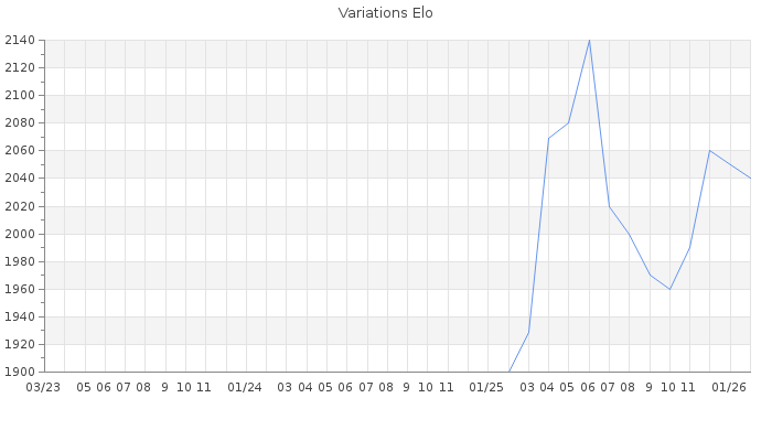 Date d'inscription : 18/04/09. Donateur pour EchecsEmail : Non ( Cliquez ici pour soutenir EchecsEmail. ) Elo non arrondi:2043.9 ( 117 sur 459 joueurs ) Nombre de victoires :186 Nombre de nulles :52 Nombre de défaites :95 Temps de réponse moyen par coup : 1J 7H 10M 14S ( Moyenne sur 127 coups ). Rd ( Un petit rd indique un elo fiable ) : 90 Elo maximum atteint ( en étant classé ) :2230 Elo maximum atteint cette année :2090 Nombre coups joués : 9991 Classement coupe : Inactif Points coupe : 0 Classement Coupe Magic Chess : Inactif Points Coupe Magic Chess : 0 Tournoi échelle : Inactif. Tournois gagnés : 04/12/2025 : Cat 4 : Victoire dans le tournoi n°26943 03/12/2025 : Cat 4 : Victoire dans le tournoi n°27189 05/08/2025 : Cat 4 : Victoire dans le tournoi n°26767 16/06/2025 : Cat 3 : Victoire dans le tournoi n°26623 29/05/2025 : Cat 4 : Victoire dans le tournoi n°26684 25/03/2019 : Cat 4 : Victoire dans le tournoi n°19321 13/10/2018 : Cat 4 : Victoire dans le tournoi n°18124 12/10/2018 : Cat 4 : Victoire dans le tournoi n°17881 15/04/2018 : Cat 4 : Victoire dans le tournoi n°16842 04/03/2018 : Cat 4 : Victoire dans le tournoi n°17292 08/03/2015 : Cat 4 : Victoire dans le tournoi n°16806 19/07/2014 : Cat 5 : Victoire dans le tournoi n°15227 07/03/2014 : Cat 5 : Victoire dans le tournoi n°14273 19/11/2013 : Cat 4 : Victoire dans le tournoi n°13818 24/10/2013 : Cat 4 : Victoire dans le tournoi n°13202 01/09/2013 : Cat 5 : Victoire dans le tournoi n°13038 07/08/2013 : Cat 4 : Victoire dans le tournoi n°12592 06/05/2013 : Cat 4 : Victoire dans le tournoi n°12056 15/07/2012 : Cat 4 : Victoire dans le tournoi n°10428 18/01/2012 : Cat 4 : Victoire dans le tournoi n°9391 04/06/2011 : Cat 3 : Victoire dans le tournoi n°8520 31/05/2011 : Cat 3 : Victoire dans le tournoi n°8630 Nombre de tournois gagnés :22