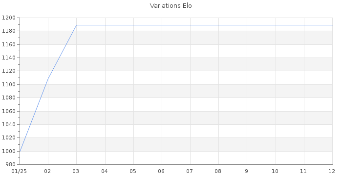 Date d'inscription : 21/01/25. Donateur pour EchecsEmail : Non ( Cliquez ici pour soutenir EchecsEmail. ) Elo non arrondi:1171.7 ( 472 sur 454 joueurs ) Nombre de victoires :2 Nombre de nulles :0 Nombre de défaites :1 Temps de réponse moyen par coup : 0J 4H 7M 19S ( Moyenne sur 1 coups ). Rd ( Un petit rd indique un elo fiable ) : 181 Elo maximum atteint ( en étant classé ) :0 Elo maximum atteint cette année :0 Nombre coups joués : 70 Classement coupe : Inactif Points coupe : 0 Classement Coupe Magic Chess : Inactif Points Coupe Magic Chess : 0 Tournoi échelle : Nombre de tournois gagnés :0