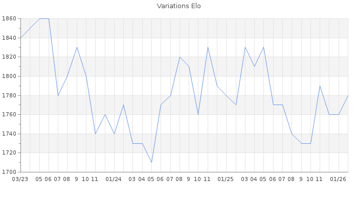 Date d'inscription : 24/10/06. Donateur pour EchecsEmail : Non ( Cliquez ici pour soutenir EchecsEmail. ) Elo non arrondi:1778.2 ( 239 sur 456 joueurs ) Nombre de victoires :4707 Nombre de nulles :817 Nombre de défaites :7001 Temps de réponse moyen par coup : 0J 5H 48M 34S ( Moyenne sur 3561 coups ). Rd ( Un petit rd indique un elo fiable ) : 51 Magic Elo:1600 Magic Rd : 350 Elo maximum atteint ( en étant classé ) :1940 Elo maximum atteint cette année :1800 Nombre coups joués : 411672 Classement coupe : Inactif Points coupe : 0 Classement Coupe Magic Chess : Inactif Points Coupe Magic Chess : 0 Tournoi échelle : Inactif. Tournois gagnés : 01/02/2025 : Cat 3 : Victoire dans le tournoi n°26394 23/01/2022 : Cat 3 : Victoire dans le tournoi n°23489 29/03/2021 : Cat 4 : Victoire dans le tournoi n°22522 13/08/2020 : Cat 3 : Victoire dans le tournoi n°21583 17/05/2020 : Cat 4 : Victoire dans le tournoi n°20955 24/03/2020 : Cat 4 : Victoire dans le tournoi n°20861 15/02/2020 : Cat 3 : Victoire dans le tournoi n°20703 11/02/2020 : Cat 4 : Victoire dans le tournoi n°20733 13/12/2019 : Cat 3 : Victoire dans le tournoi n°20470 10/12/2019 : Cat 3 : Victoire dans le tournoi n°20448 28/11/2019 : Cat 3 : Victoire dans le tournoi n°20324 27/10/2019 : Cat 3 : Victoire dans le tournoi n°20241 27/09/2019 : Cat 4 : Victoire dans le tournoi n°20130 24/09/2019 : Cat 3 : Victoire dans le tournoi n°20131 20/09/2019 : Cat 3 : Victoire dans le tournoi n°19885 23/08/2019 : Cat 3 : Victoire dans le tournoi n°19571 14/05/2019 : Cat 3 : Victoire dans le tournoi n°19496 29/04/2019 : Cat 3 : Victoire dans le tournoi n°19547 26/03/2019 : Cat 3 : Victoire dans le tournoi n°19395 20/03/2019 : Cat 3 : Victoire dans le tournoi n°19296 01/03/2019 : Cat 3 : Victoire dans le tournoi n°18959 22/02/2019 : Cat 3 : Victoire dans le tournoi n°19104 07/02/2019 : Cat 4 : Victoire dans le tournoi n°19174 29/01/2019 : Cat 4 : Victoire dans le tournoi n°19128 23/01/2019 : Cat 3 : Victoire dans le tournoi n°19198 30/12/2018 : Cat 3 : Victoire dans le tournoi n°19073 10/12/2018 : Cat 3 : Victoire dans le tournoi n°19032 20/11/2018 : Cat 3 : Victoire dans le tournoi n°18868 18/09/2018 : Cat 3 : Victoire dans le tournoi n°18553 15/09/2018 : Cat 3 : Victoire dans le tournoi n°18546 14/09/2018 : Cat 3 : Victoire dans le tournoi n°18495 10/09/2018 : Cat 3 : Victoire dans le tournoi n°18515 27/08/2018 : Cat 3 : Victoire dans le tournoi n°18405 20/08/2018 : Cat 3 : Victoire dans le tournoi n°18486 03/08/2018 : Cat 3 : Victoire dans le tournoi n°18449 30/07/2018 : Cat 3 : Victoire dans le tournoi n°18231 29/07/2018 : Cat 3 : Victoire dans le tournoi n°18323 18/07/2018 : Cat 3 : Victoire dans le tournoi n°18361 12/06/2018 : Cat 3 : Victoire dans le tournoi n°18140 07/06/2018 : Cat 3 : Victoire dans le tournoi n°17921 26/05/2018 : Cat 3 : Victoire dans le tournoi n°18096 02/05/2018 : Cat 3 : Victoire dans le tournoi n°17928 12/04/2018 : Cat 3 : Victoire dans le tournoi n°17915 12/03/2018 : Cat 3 : Victoire dans le tournoi n°17637 06/03/2018 : Cat 3 : Victoire dans le tournoi n°17818 17/02/2018 : Cat 3 : Victoire dans le tournoi n°17533 01/02/2018 : Cat 3 : Victoire dans le tournoi n°17670 24/01/2018 : Cat 3 : Victoire dans le tournoi n°17611 03/01/2018 : Cat 3 : Victoire dans le tournoi n°17462 31/12/2017 : Cat 3 : Victoire dans le tournoi n°17326 28/12/2017 : Cat 3 : Victoire dans le tournoi n°17418 27/12/2017 : Cat 3 : Victoire dans le tournoi n°17455 25/11/2017 : Cat 3 : Victoire dans le tournoi n°17313 17/11/2017 : Cat 3 : Victoire dans le tournoi n°17283 10/11/2017 : Cat 3 : Victoire dans le tournoi n°17200 26/09/2017 : Cat 3 : Victoire dans le tournoi n°17085 21/09/2017 : Cat 3 : Victoire dans le tournoi n°17038 08/09/2017 : Cat 3 : Victoire dans le tournoi n°16978 22/08/2017 : Cat 3 : Victoire dans le tournoi n°16954 14/08/2017 : Cat 3 : Victoire dans le tournoi n°16932 25/07/2017 : Cat 3 : Victoire dans le tournoi n°16860 12/07/2017 : Cat 3 : Victoire dans le tournoi n°16700 23/06/2017 : Cat 3 : Victoire dans le tournoi n°16595 05/06/2017 : Cat 3 : Victoire dans le tournoi n°16583 30/05/2017 : Cat 3 : Victoire dans le tournoi n°16625 19/03/2017 : Cat 3 : Victoire dans le tournoi n°16202 16/03/2017 : Cat 3 : Victoire dans le tournoi n°16271 23/02/2017 : Cat 3 : Victoire dans le tournoi n°15980 25/01/2017 : Cat 3 : Victoire dans le tournoi n°16024 23/01/2017 : Cat 3 : Victoire dans le tournoi n°16016 21/01/2017 : Cat 3 : Victoire dans le tournoi n°15962 15/01/2017 : Cat 3 : Victoire dans le tournoi n°15859 08/11/2016 : Cat 3 : Victoire dans le tournoi n°15592 15/10/2016 : Cat 3 : Victoire dans le tournoi n°15552 25/09/2016 : Cat 3 : Victoire dans le tournoi n°15391 04/09/2016 : Cat 3 : Victoire dans le tournoi n°15316 27/08/2016 : Cat 3 : Victoire dans le tournoi n°15176 28/06/2016 : Cat 3 : Victoire dans le tournoi n°14946 22/06/2016 : Cat 3 : Victoire dans le tournoi n°14867 17/05/2016 : Cat 3 : Victoire dans le tournoi n°14841 01/05/2016 : Cat 3 : Victoire dans le tournoi n°14671 28/04/2016 : Cat 3 : Victoire dans le tournoi n°14597 22/04/2016 : Cat 3 : Victoire dans le tournoi n°14404 15/04/2016 : Cat 3 : Victoire dans le tournoi n°14700 30/03/2016 : Cat 3 : Victoire dans le tournoi n°14573 26/02/2016 : Cat 3 : Victoire dans le tournoi n°14227 04/01/2016 : Cat 3 : Victoire dans le tournoi n°18976 27/11/2015 : Cat 3 : Victoire dans le tournoi n°18781 20/10/2015 : Cat 3 : Victoire dans le tournoi n°18416 08/12/2014 : Cat 3 : Victoire dans le tournoi n°16227 26/10/2014 : Cat 3 : Victoire dans le tournoi n°16189 24/10/2014 : Cat 3 : Victoire dans le tournoi n°16232 13/10/2014 : Cat 3 : Victoire dans le tournoi n°16113 25/02/2014 : Cat 3 : Victoire dans le tournoi n°14734 16/12/2013 : Cat 3 : Victoire dans le tournoi n°13772 05/07/2013 : Cat 3 : Victoire dans le tournoi n°12901 06/12/2012 : Cat 3 : Victoire dans le tournoi n°11088 15/03/2011