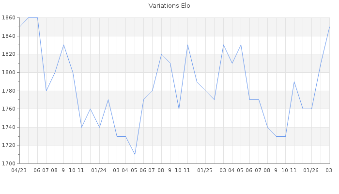 Date d'inscription : 24/10/06. Donateur pour EchecsEmail : Non ( Cliquez ici pour soutenir EchecsEmail. ) Elo non arrondi:1852.5 ( 202 sur 445 joueurs ) Nombre de victoires :4740 Nombre de nulles :823 Nombre de défaites :7048 Temps de réponse moyen par coup : 0J 5H 45M 7S ( Moyenne sur 4187 coups ). Rd ( Un petit rd indique un elo fiable ) : 50 Magic Elo:1600 Magic Rd : 350 Elo maximum atteint ( en étant classé ) :1940 Elo maximum atteint cette année :1850 Nombre coups joués : 414689 Classement coupe : Inactif Points coupe : 0 Classement Coupe Magic Chess : Inactif Points Coupe Magic Chess : 0 Tournoi échelle : Inactif. Tournois gagnés : 01/02/2025 : Cat 3 : Victoire dans le tournoi n°26394 23/01/2022 : Cat 3 : Victoire dans le tournoi n°23489 29/03/2021 : Cat 4 : Victoire dans le tournoi n°22522 13/08/2020 : Cat 3 : Victoire dans le tournoi n°21583 17/05/2020 : Cat 4 : Victoire dans le tournoi n°20955 24/03/2020 : Cat 4 : Victoire dans le tournoi n°20861 15/02/2020 : Cat 3 : Victoire dans le tournoi n°20703 11/02/2020 : Cat 4 : Victoire dans le tournoi n°20733 13/12/2019 : Cat 3 : Victoire dans le tournoi n°20470 10/12/2019 : Cat 3 : Victoire dans le tournoi n°20448 28/11/2019 : Cat 3 : Victoire dans le tournoi n°20324 27/10/2019 : Cat 3 : Victoire dans le tournoi n°20241 27/09/2019 : Cat 4 : Victoire dans le tournoi n°20130 24/09/2019 : Cat 3 : Victoire dans le tournoi n°20131 20/09/2019 : Cat 3 : Victoire dans le tournoi n°19885 23/08/2019 : Cat 3 : Victoire dans le tournoi n°19571 14/05/2019 : Cat 3 : Victoire dans le tournoi n°19496 29/04/2019 : Cat 3 : Victoire dans le tournoi n°19547 26/03/2019 : Cat 3 : Victoire dans le tournoi n°19395 20/03/2019 : Cat 3 : Victoire dans le tournoi n°19296 01/03/2019 : Cat 3 : Victoire dans le tournoi n°18959 22/02/2019 : Cat 3 : Victoire dans le tournoi n°19104 07/02/2019 : Cat 4 : Victoire dans le tournoi n°19174 29/01/2019 : Cat 4 : Victoire dans le tournoi n°19128 23/01/2019 : Cat 3 : Victoire dans le tournoi n°19198 30/12/2018 : Cat 3 : Victoire dans le tournoi n°19073 10/12/2018 : Cat 3 : Victoire dans le tournoi n°19032 20/11/2018 : Cat 3 : Victoire dans le tournoi n°18868 18/09/2018 : Cat 3 : Victoire dans le tournoi n°18553 15/09/2018 : Cat 3 : Victoire dans le tournoi n°18546 14/09/2018 : Cat 3 : Victoire dans le tournoi n°18495 10/09/2018 : Cat 3 : Victoire dans le tournoi n°18515 27/08/2018 : Cat 3 : Victoire dans le tournoi n°18405 20/08/2018 : Cat 3 : Victoire dans le tournoi n°18486 03/08/2018 : Cat 3 : Victoire dans le tournoi n°18449 30/07/2018 : Cat 3 : Victoire dans le tournoi n°18231 29/07/2018 : Cat 3 : Victoire dans le tournoi n°18323 18/07/2018 : Cat 3 : Victoire dans le tournoi n°18361 12/06/2018 : Cat 3 : Victoire dans le tournoi n°18140 07/06/2018 : Cat 3 : Victoire dans le tournoi n°17921 26/05/2018 : Cat 3 : Victoire dans le tournoi n°18096 02/05/2018 : Cat 3 : Victoire dans le tournoi n°17928 12/04/2018 : Cat 3 : Victoire dans le tournoi n°17915 12/03/2018 : Cat 3 : Victoire dans le tournoi n°17637 06/03/2018 : Cat 3 : Victoire dans le tournoi n°17818 17/02/2018 : Cat 3 : Victoire dans le tournoi n°17533 01/02/2018 : Cat 3 : Victoire dans le tournoi n°17670 24/01/2018 : Cat 3 : Victoire dans le tournoi n°17611 03/01/2018 : Cat 3 : Victoire dans le tournoi n°17462 31/12/2017 : Cat 3 : Victoire dans le tournoi n°17326 28/12/2017 : Cat 3 : Victoire dans le tournoi n°17418 27/12/2017 : Cat 3 : Victoire dans le tournoi n°17455 25/11/2017 : Cat 3 : Victoire dans le tournoi n°17313 17/11/2017 : Cat 3 : Victoire dans le tournoi n°17283 10/11/2017 : Cat 3 : Victoire dans le tournoi n°17200 26/09/2017 : Cat 3 : Victoire dans le tournoi n°17085 21/09/2017 : Cat 3 : Victoire dans le tournoi n°17038 08/09/2017 : Cat 3 : Victoire dans le tournoi n°16978 22/08/2017 : Cat 3 : Victoire dans le tournoi n°16954 14/08/2017 : Cat 3 : Victoire dans le tournoi n°16932 25/07/2017 : Cat 3 : Victoire dans le tournoi n°16860 12/07/2017 : Cat 3 : Victoire dans le tournoi n°16700 23/06/2017 : Cat 3 : Victoire dans le tournoi n°16595 05/06/2017 : Cat 3 : Victoire dans le tournoi n°16583 30/05/2017 : Cat 3 : Victoire dans le tournoi n°16625 19/03/2017 : Cat 3 : Victoire dans le tournoi n°16202 16/03/2017 : Cat 3 : Victoire dans le tournoi n°16271 23/02/2017 : Cat 3 : Victoire dans le tournoi n°15980 25/01/2017 : Cat 3 : Victoire dans le tournoi n°16024 23/01/2017 : Cat 3 : Victoire dans le tournoi n°16016 21/01/2017 : Cat 3 : Victoire dans le tournoi n°15962 15/01/2017 : Cat 3 : Victoire dans le tournoi n°15859 08/11/2016 : Cat 3 : Victoire dans le tournoi n°15592 15/10/2016 : Cat 3 : Victoire dans le tournoi n°15552 25/09/2016 : Cat 3 : Victoire dans le tournoi n°15391 04/09/2016 : Cat 3 : Victoire dans le tournoi n°15316 27/08/2016 : Cat 3 : Victoire dans le tournoi n°15176 28/06/2016 : Cat 3 : Victoire dans le tournoi n°14946 22/06/2016 : Cat 3 : Victoire dans le tournoi n°14867 17/05/2016 : Cat 3 : Victoire dans le tournoi n°14841 01/05/2016 : Cat 3 : Victoire dans le tournoi n°14671 28/04/2016 : Cat 3 : Victoire dans le tournoi n°14597 22/04/2016 : Cat 3 : Victoire dans le tournoi n°14404 15/04/2016 : Cat 3 : Victoire dans le tournoi n°14700 30/03/2016 : Cat 3 : Victoire dans le tournoi n°14573 26/02/2016 : Cat 3 : Victoire dans le tournoi n°14227 04/01/2016 : Cat 3 : Victoire dans le tournoi n°18976 27/11/2015 : Cat 3 : Victoire dans le tournoi n°18781 20/10/2015 : Cat 3 : Victoire dans le tournoi n°18416 08/12/2014 : Cat 3 : Victoire dans le tournoi n°16227 26/10/2014 : Cat 3 : Victoire dans le tournoi n°16189 24/10/2014 : Cat 3 : Victoire dans le tournoi n°16232 13/10/2014 : Cat 3 : Victoire dans le tournoi n°16113 25/02/2014 : Cat 3 : Victoire dans le tournoi n°14734 16/12/2013 : Cat 3 : Victoire dans le tournoi n°13772 05/07/2013 : Cat 3 : Victoire dans le tournoi n°12901 06/12/2012 : Cat 3 : Victoire dans le tournoi n°11088 15/03/2011 
