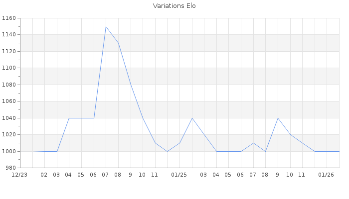 Date d'inscription : 15/12/23. Donateur pour EchecsEmail : Non ( Cliquez ici pour soutenir EchecsEmail. ) Elo non arrondi:1000 ( 457 sur 459 joueurs ) Nombre de victoires :18 Nombre de nulles :0 Nombre de défaites :161 Temps de réponse moyen par coup : 0J 7H 40M 34S ( Moyenne sur 648 coups ). Rd ( Un petit rd indique un elo fiable ) : 86 Elo maximum atteint ( en étant classé ) :1150 Elo maximum atteint cette année :1000 Nombre coups joués : 5614 Classement coupe : Inactif Points coupe : 0 Classement Coupe Magic Chess : Inactif Points Coupe Magic Chess : 0 Tournoi échelle : Nombre de tournois gagnés :0
