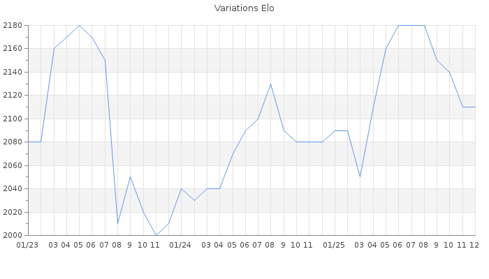 Date d'inscription : 25/08/10. Donateur pour EchecsEmail : Non ( Cliquez ici pour soutenir EchecsEmail. ) Elo non arrondi:2114.3 ( 82 sur 449 joueurs ) Nombre de victoires :961 Nombre de nulles :184 Nombre de défaites :680 Temps de réponse moyen par coup : 0J 8H 49M 9S ( Moyenne sur 145 coups ). Rd ( Un petit rd indique un elo fiable ) : 87 Magic Elo:1600 Magic Rd : 350 Elo maximum atteint ( en étant classé ) :2220 Elo maximum atteint cette année :2180 Nombre coups joués : 62760 Inscrit dans l' équipe:cotenstock Classement coupe : Inactif, date de la dernière qualification : 19/09/23 Points coupe : 93.91 Classement Coupe Magic Chess : Inactif Points Coupe Magic Chess : 0 Tournoi échelle : Inactif. Tournois gagnés : 18/02/2024 : Cat 4 : Victoire dans le tournoi n°25557 04/06/2022 : Cat 4 : Victoire dans le tournoi n°23683 13/11/2017 : Cat 4 : Victoire dans le tournoi n°17266 16/06/2011 : Cat 3 : Victoire dans le tournoi n°8649 01/03/2011 : Cat 4 : Victoire dans le tournoi n°8088 27/12/2010 : Cat 4 : Victoire dans le tournoi n°8119 16/09/2010 : Cat 2 : Victoire dans le tournoi n°7763 Nombre de tournois gagnés :7