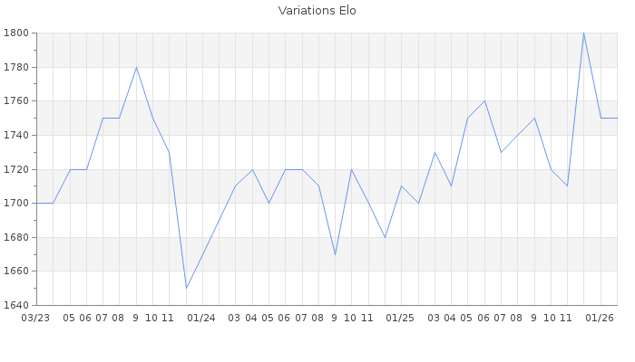 Date d'inscription : 13/10/10. Donateur pour EchecsEmail : Non ( Cliquez ici pour soutenir EchecsEmail. ) Elo non arrondi:1747.6 ( 259 sur 463 joueurs ) Nombre de victoires :1344 Nombre de nulles :180 Nombre de défaites :1475 Temps de réponse moyen par coup : 0J 9H 22M 0S ( Moyenne sur 618 coups ). Rd ( Un petit rd indique un elo fiable ) : 62 Magic Elo:1348.25 Magic Rd : 258 Elo maximum atteint ( en étant classé ) :1890 Elo maximum atteint cette année :1780 Nombre coups joués : 127447 Classement coupe : Inactif Points coupe : 0 Classement Coupe Magic Chess : Inactif Points Coupe Magic Chess : 0 Tournoi échelle : Nombre de tournois gagnés :0