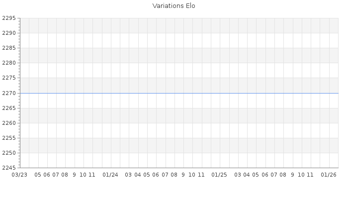 Date d'inscription : 23/11/19. Donateur pour EchecsEmail : Non ( Cliquez ici pour soutenir EchecsEmail. ) Elo non arrondi:2213.9 ( 74 sur 459 joueurs ) Nombre de victoires :138 Nombre de nulles :26 Nombre de défaites :26 Rd ( Un petit rd indique un elo fiable ) : 67 Elo maximum atteint ( en étant classé ) :2280 Elo maximum atteint cette année :0 Nombre coups joués : 5487 Classement coupe : Inactif Points coupe : 0 Classement Coupe Magic Chess : Inactif Points Coupe Magic Chess : 0 Tournoi échelle : Tournois gagnés : 03/04/2020 : Cat 4 : Victoire dans le tournoi n°20864 08/02/2020 : Cat 4 : Victoire dans le tournoi n°20648 20/12/2019 : Cat 1 : Victoire dans le tournoi n°20473 Nombre de tournois gagnés :3
