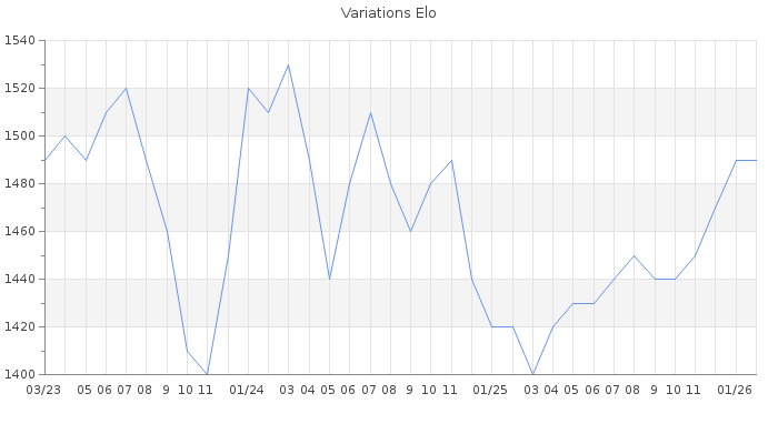 Date d'inscription : 06/01/08. Donateur pour EchecsEmail : Non ( Cliquez ici pour soutenir EchecsEmail. ) Elo non arrondi:1493.5 ( 377 sur 463 joueurs ) Nombre de victoires :754 Nombre de nulles :72 Nombre de défaites :909 Temps de réponse moyen par coup : 0J 4H 5M 59S ( Moyenne sur 430 coups ). Rd ( Un petit rd indique un elo fiable ) : 68 Elo maximum atteint ( en étant classé ) :1640 Elo maximum atteint cette année :1500 Nombre coups joués : 66888 Classement coupe : Inactif Points coupe : 0 Classement Coupe Magic Chess : Inactif Points Coupe Magic Chess : 0 Tournoi échelle : Nombre de tournois gagnés :0