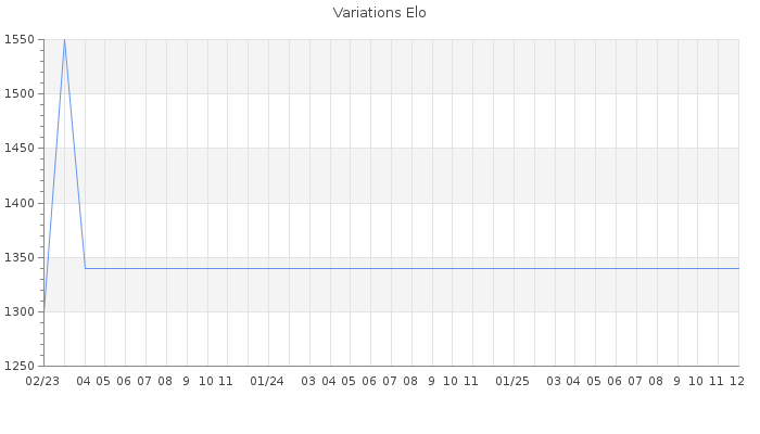 Date d'inscription : 20/02/23. Donateur pour EchecsEmail : Non ( Cliquez ici pour soutenir EchecsEmail. ) Elo non arrondi:1307.5 ( 512 sur 448 joueurs ) Nombre de victoires :9 Nombre de nulles :0 Nombre de défaites :12 Temps de réponse moyen par coup : 0J 13H 11M 56S ( Moyenne sur 0 coups ). Rd ( Un petit rd indique un elo fiable ) : 96 Elo maximum atteint ( en étant classé ) :1650 Elo maximum atteint cette année :0 Nombre coups joués : 458 Classement coupe : Inactif Points coupe : 0 Classement Coupe Magic Chess : Inactif Points Coupe Magic Chess : 0 Tournoi échelle : Tournois gagnés : 21/03/2023 : Cat 1 : Victoire dans le tournoi n°24678 Nombre de tournois gagnés :1