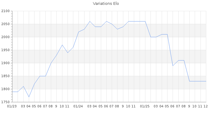 Date d'inscription : 30/05/13. Donateur pour EchecsEmail : Non ( Cliquez ici pour soutenir EchecsEmail. ) Elo non arrondi:1828.6 ( 178 sur 448 joueurs ) Nombre de victoires :532 Nombre de nulles :52 Nombre de défaites :312 Temps de réponse moyen par coup : 0J 17H 53M 24S ( Moyenne sur 7 coups ). Rd ( Un petit rd indique un elo fiable ) : 113 Magic Elo:1711.8 Magic Rd : 262 Elo maximum atteint ( en étant classé ) :2070 Elo maximum atteint cette année :2010 Nombre coups joués : 28477 Inscrit dans l' équipe:Royal Kids Classement coupe : Inactif Points coupe : 0 Classement Coupe Magic Chess : Inactif Points Coupe Magic Chess : 0 Tournoi échelle : Tournois gagnés : 18/01/2024 : Cat 4 : Victoire dans le tournoi n°25490 16/07/2023 : Cat 3 : Victoire dans le tournoi n°24932 23/09/2019 : Cat 3 : Victoire dans le tournoi n°20149 21/10/2015 : Cat 3 : Victoire dans le tournoi n°18504 19/07/2015 : Cat 3 : Victoire dans le tournoi n°17631 07/01/2015 : Cat 2 : Victoire dans le tournoi n°16606 11/12/2014 : Cat 2 : Victoire dans le tournoi n°16556 26/11/2014 : Cat 2 : Victoire dans le tournoi n°16507 Nombre de tournois gagnés :8