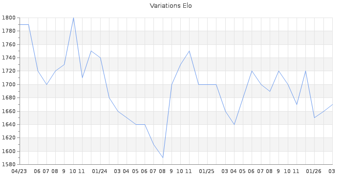 Date d'inscription : 05/12/10. Donateur pour EchecsEmail : Non ( Cliquez ici pour soutenir EchecsEmail. ) Elo non arrondi:1668.9 ( 284 sur 448 joueurs ) Nombre de victoires :1239 Nombre de nulles :81 Nombre de défaites :1529 Temps de réponse moyen par coup : 0J 5H 7M 27S ( Moyenne sur 1617 coups ). Rd ( Un petit rd indique un elo fiable ) : 50 Elo maximum atteint ( en étant classé ) :1880 Elo maximum atteint cette année :1730 Nombre coups joués : 106500 Classement coupe : Inactif Points coupe : 0 Classement Coupe Magic Chess : Inactif Points Coupe Magic Chess : 0 Tournoi échelle : Nombre de tournois gagnés :0