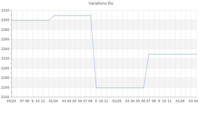 Date d'inscription : 12/09/07. Donateur pour EchecsEmail : Non ( Cliquez ici pour soutenir EchecsEmail. ) Elo non arrondi:2201 ( 58 sur 453 joueurs ) Nombre de victoires :83 Nombre de nulles :11 Nombre de défaites :7 Temps de réponse moyen par coup : 0J 16H 59M 33S ( Moyenne sur 11 coups ). Rd ( Un petit rd indique un elo fiable ) : 269 Magic Elo:1600 Magic Rd : 350 Elo maximum atteint ( en étant classé ) :2380 Elo maximum atteint cette année :0 Nombre coups joués : 2902 Classement coupe : Inactif Points coupe : 0 Classement Coupe Magic Chess : Inactif Points Coupe Magic Chess : 0 Tournoi échelle : Nombre de tournois gagnés :0