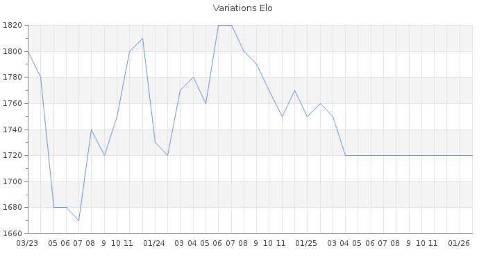 Date d'inscription : 14/12/15. Donateur pour EchecsEmail : Non ( Cliquez ici pour soutenir EchecsEmail. ) Elo non arrondi:1696.3 ( 295 sur 461 joueurs ) Nombre de victoires :435 Nombre de nulles :76 Nombre de défaites :467 Temps de réponse moyen par coup : 0J 9H 12M 35S ( Moyenne sur 2 coups ). Rd ( Un petit rd indique un elo fiable ) : 84 Magic Elo:1600 Magic Rd : 350 Elo maximum atteint ( en étant classé ) :1990 Elo maximum atteint cette année :0 Nombre coups joués : 37374 Classement coupe : Inactif Points coupe : 0.02 Classement Coupe Magic Chess : Inactif Points Coupe Magic Chess : 0 Tournoi échelle : Inactif. Tournois gagnés : 24/06/2024 : Cat 3 : Victoire dans le tournoi n°25871 03/04/2024 : Cat 3 : Victoire dans le tournoi n°25676 03/11/2023 : Cat 3 : Victoire dans le tournoi n°25270 08/09/2023 : Cat 2 : Victoire dans le tournoi n°25111 07/05/2023 : Cat 3 : Victoire dans le tournoi n°24658 07/09/2022 : Cat 3 : Victoire dans le tournoi n°24148 06/06/2022 : Cat 2 : Victoire dans le tournoi n°23947 27/11/2021 : Cat 2 : Victoire dans le tournoi n°23354 10/11/2019 : Cat 3 : Victoire dans le tournoi n°20340 28/02/2019 : Cat 3 : Victoire dans le tournoi n°18929 30/12/2017 : Cat 3 : Victoire dans le tournoi n°17254 27/06/2017 : Cat 3 : Victoire dans le tournoi n°16556 25/01/2016 : Cat 3 : Victoire dans le tournoi n°14201 Nombre de tournois gagnés :13