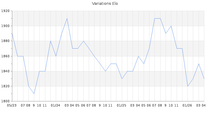 Date d'inscription : 10/02/07. Donateur pour EchecsEmail : Non ( Cliquez ici pour soutenir EchecsEmail. ) Elo non arrondi:1833.5 ( 211 sur 450 joueurs ) Nombre de victoires :976 Nombre de nulles :163 Nombre de défaites :943 Temps de réponse moyen par coup : 0J 5H 35M 21S ( Moyenne sur 756 coups ). Rd ( Un petit rd indique un elo fiable ) : 65 Magic Elo:1757.28 Magic Rd : 80 Elo maximum atteint ( en étant classé ) :1930 Elo maximum atteint cette année :1880 Nombre coups joués : 103829 Inscrit dans l' équipe:Avalon Classement coupe : Inactif Points coupe : 0.1 Classement Coupe Magic Chess : Inactif, date de la dernière qualification : 10/07/24 Points Coupe Magic Chess : 2.98 Tournoi échelle : Inactif. Tournois gagnés : 19/04/2022 : Cat 3 : Victoire dans le tournoi n°23145 17/12/2021 : Cat 3 : Victoire dans le tournoi n°23373 02/08/2021 : Cat 3 : Victoire dans le tournoi n°22963 09/02/2020 : Cat 3 : Victoire dans le tournoi n°20671 20/11/2018 : Cat 4 : Victoire dans le tournoi n°18940 01/11/2018 : Cat 3 : Victoire dans le tournoi n°18865 06/01/2018 : Cat 3 : Victoire dans le tournoi n°17495 31/12/2017 : Cat 3 : Victoire dans le tournoi n°17509 15/09/2013 : Cat 3 : Victoire dans le tournoi n°13340 26/08/2013 : Cat 3 : Victoire dans le tournoi n°13058 06/04/2013 : Cat 3 : Victoire dans le tournoi n°12275 08/10/2012 : Cat 2 : Victoire dans le tournoi n°10824 Nombre de tournois gagnés :12