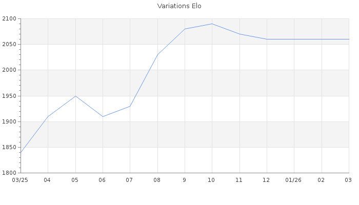 Date d'inscription : 15/03/25. Donateur pour EchecsEmail : Non ( Cliquez ici pour soutenir EchecsEmail. ) Elo non arrondi:2059.8 ( 100 sur 438 joueurs ) Nombre de victoires :192 Nombre de nulles :38 Nombre de défaites :81 Temps de réponse moyen par coup : 0J 1H 52M 1S ( Moyenne sur 1187 coups ). Rd ( Un petit rd indique un elo fiable ) : 63 Elo maximum atteint ( en étant classé ) :2150 Elo maximum atteint cette année :2070 Nombre coups joués : 11150 Classement coupe : 34 Points coupe : 1172.35 Classement Coupe Magic Chess : Inactif Points Coupe Magic Chess : 0 Tournoi échelle : Inactif. Tournois gagnés : 20/10/2025 : Cat 4 : Victoire dans le tournoi n°27111 16/10/2025 : Cat 4 : Victoire dans le tournoi n°27035 13/10/2025 : Cat 4 : Victoire dans le tournoi n°27055 12/10/2025 : Cat 4 : Victoire dans le tournoi n°27095 08/10/2025 : Cat 4 : Victoire dans le tournoi n°27086 02/09/2025 : Cat 4 : Victoire dans le tournoi n°27020 25/08/2025 : Cat 4 : Victoire dans le tournoi n°26977 12/05/2025 : Cat 4 : Victoire dans le tournoi n°26718 05/05/2025 : Cat 3 : Victoire dans le tournoi n°26679 01/05/2025 : Cat 3 : Victoire dans le tournoi n°26653 09/04/2025 : Cat 2 : Victoire dans le tournoi n°26651 05/04/2025 : Cat 2 : Victoire dans le tournoi n°26635 03/04/2025 : Cat 1 : Victoire dans le tournoi n°26622 26/03/2025 : Cat 1 : Victoire dans le tournoi n°26617 Nombre de tournois gagnés :14