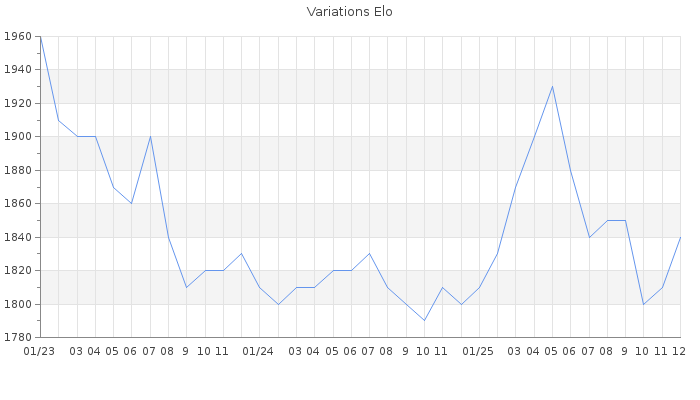 Date d'inscription : Avant le 20/12/05. Donateur pour EchecsEmail : Oui ( Cliquez ici pour soutenir EchecsEmail. ) Elo non arrondi:1837.4 ( 203 sur 448 joueurs ) Nombre de victoires :1494 Nombre de nulles :195 Nombre de défaites :1150 Temps de réponse moyen par coup : 0J 10H 50M 42S ( Moyenne sur 775 coups ). Rd ( Un petit rd indique un elo fiable ) : 66 Magic Elo:1600.07 Magic Rd : 350 Elo maximum atteint ( en étant classé ) :2010 Elo maximum atteint cette année :1940 Nombre coups joués : 108099 Inscrit dans l' équipe:La Diagonale du Fou Classement coupe : Inactif, date de la dernière qualification : 08/01/24 Points coupe : 88.95 Classement Coupe Magic Chess : Inactif Points Coupe Magic Chess : 0 Tournoi échelle : Inactif. Tournois gagnés : 24/05/2024 : Cat 4 : Victoire dans le tournoi n°25505 25/08/2021 : Cat 4 : Victoire dans le tournoi n°22948 28/04/2021 : Cat 3 : Premier au tournoi multi Printemps 2021 n°4 28/05/2020 : Cat 4 : Victoire dans le tournoi n°21272 02/01/2020 : Cat 4 : Victoire dans le tournoi n°20361 03/08/2019 : Cat 4 : Victoire dans le tournoi n°19664 10/06/2019 : Cat 4 : Premier au tournoi multi Printemps 2019 n°3 16/02/2019 : Cat 4 : Victoire dans le tournoi n°19077 12/12/2018 : Cat 4 : Victoire dans le tournoi n°19003 02/12/2018 : Cat 3 : Victoire dans le tournoi n°19001 06/11/2018 : Cat 3 : Victoire dans le tournoi n°18885 27/04/2018 : Cat 3 : Victoire dans le tournoi n°17971 06/03/2018 : Cat 3 : Victoire dans le tournoi n°17763 29/07/2017 : Cat 4 : Victoire dans le tournoi n°16823 24/04/2017 : Cat 4 : Victoire dans le tournoi n°16483 03/12/2016 : Cat 4 : Victoire dans le tournoi n°15763 26/10/2016 : Cat 4 : Victoire dans le tournoi n°15576 09/04/2015 : Cat 3 : Victoire dans le tournoi n°17407 21/02/2014 : Cat 3 : Victoire dans le tournoi n°14369 27/04/2013 : Cat 4 : Victoire dans le tournoi n°11449 27/02/2011 : Cat 3 : Victoire dans le tournoi n°8340 04/11/2009 : Cat 3 : Victoire dans le tournoi n°6343 28/09/2009 : Cat 3 : Victoire dans le tournoi n°6157 16/05/2008 : Cat 3 : Victoire dans le tournoi n°4858 05/09/2007 : Cat 2 : Victoire dans le tournoi n°4164 26/06/2007 : Cat 1 : Victoire dans le tournoi n°3992 13/07/2006 : Cat 1 : Victoire dans le tournoi n°2669 11/06/2006 : Cat 1 : Victoire dans le tournoi n°2790 10/06/2006 : Cat 1 : Victoire dans le tournoi n°2722 Nombre de tournois gagnés :31